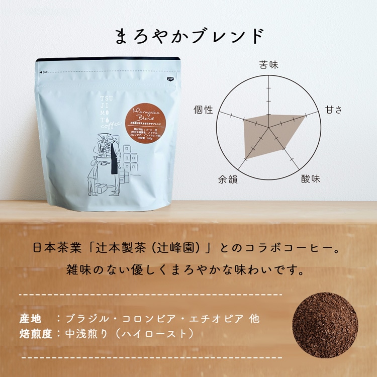 日本緑茶の滋味に精通したお茶の辻峰園と辻本珈琲の共同開発による創作ブレンドコーヒー。 高品質なコーヒー豆特有のフルーティーな香りに口に広がる柔らかな酸味の上品な味わいで、特に女性のお客様に支持いただいております。 アメリカンタイプのコーヒーが好みの方にもオススメです。