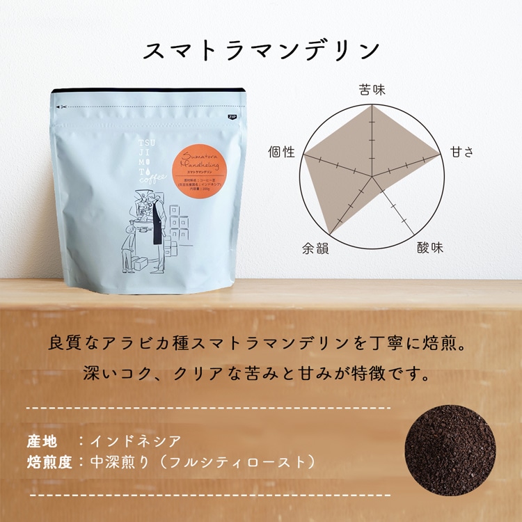 じっくり丁寧に焙煎したスマトラマンデリンは、深いコクにするりと喉を抜けるクリアな苦みと甘みがガップリ4つに組み合った大人のコーヒーです。