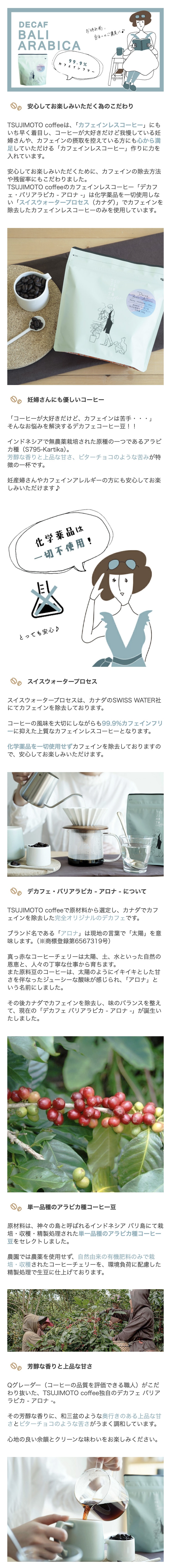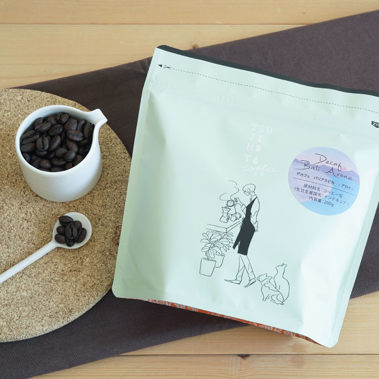 TSUJIMOTO coffeeで原材料から選定し、カナダでカフェインを除去した完全オリジナルのデカフェです。 原材料は、神々の島と呼ばれるインドネシア バリ島にて栽培・収穫・精製処理された単一品種のアラビカ種コーヒー豆をセレクトしました。 農薬を使用せず、自然由来の有機肥料のみで栽培・収穫されたコーヒーチェリーを、環境負荷に配慮した精製処理で生豆に仕上げております。 もちろん化学薬品を一切使用しない「スイスウォータープロセス」にてカフェインを除去(99.9%カフェインフリー)しているので、妊婦さんにも安心してお楽しみいただけます。 その芳醇な香りに、和三盆のような奥行きのある上品な甘さとビターチョコのような苦みがうまく調和しています。 心地の良い余韻とクリーンな味わいをお楽しみください。