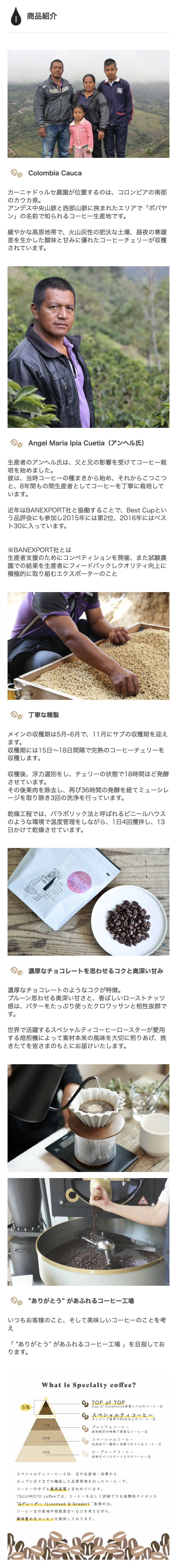 品種:カスティージョ 精製:ウォッシュド 濃厚なチョコレートのようなコクが特徴。 プルーン思わせる奥深い甘さと、香ばしいローストナッツ感は、バターをたっぷり使ったクロワッサンと相性抜群です。 世界で活躍するスペシャルティコーヒーロースターが愛用する焙煎機によって素材本来の風味を大切に煎りあげ、挽きたてを皆さまのもとにお届けいたします。