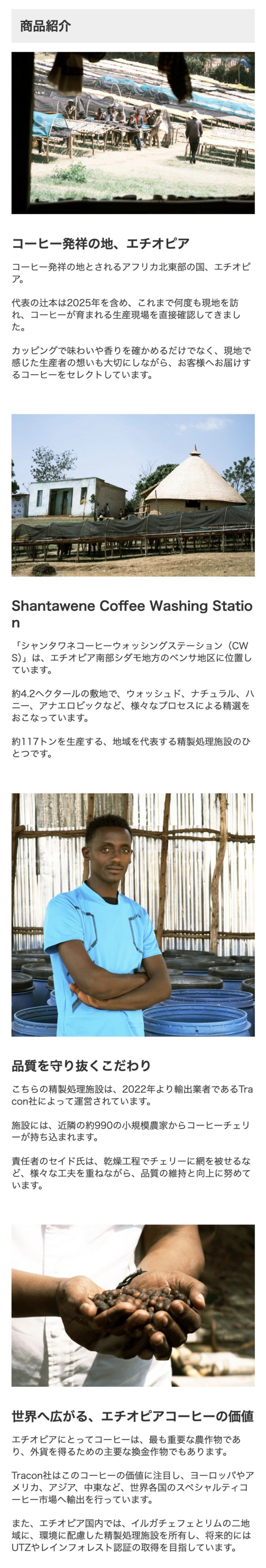品種:エチオピア原種 精製:ウォッシュド 規格:G1 華やかで芳醇な香りとダークチョコレートのようなボリュームのあるコクが、優雅なひとときを彷彿とさせます。 ふいに顔を出すドライフルーツのようなやわらかい果実味が彩りを添え、さらに味わい深い一杯へと導きます。 世界で活躍するスペシャルティコーヒーロースターが愛用する焙煎機によって素材本来の風味を大切に煎りあげ、挽きたてを皆さまのもとにお届けいたします。