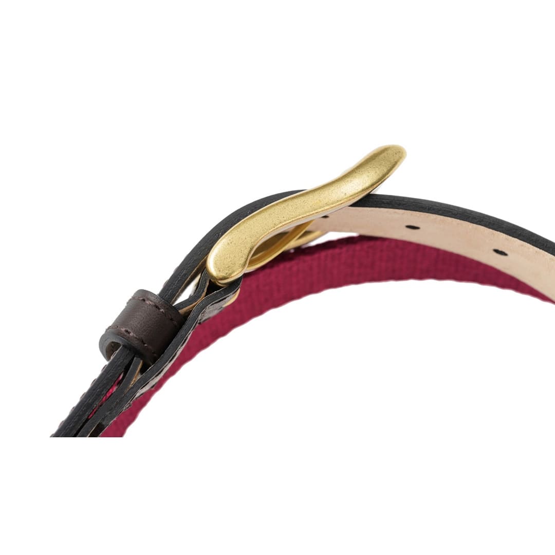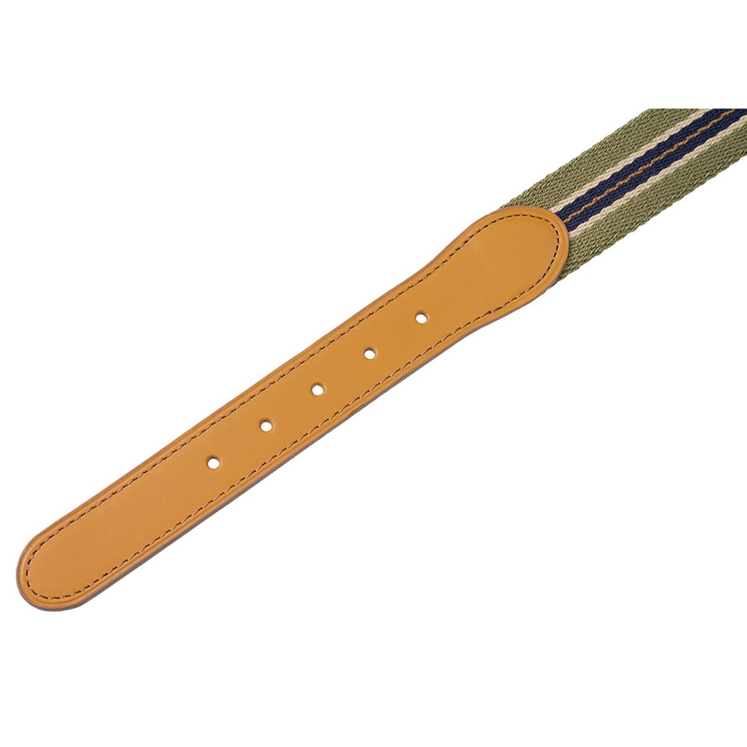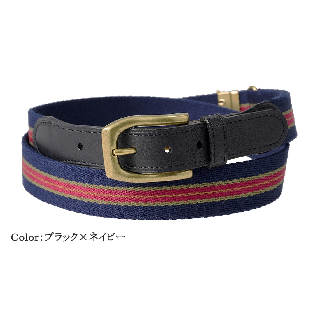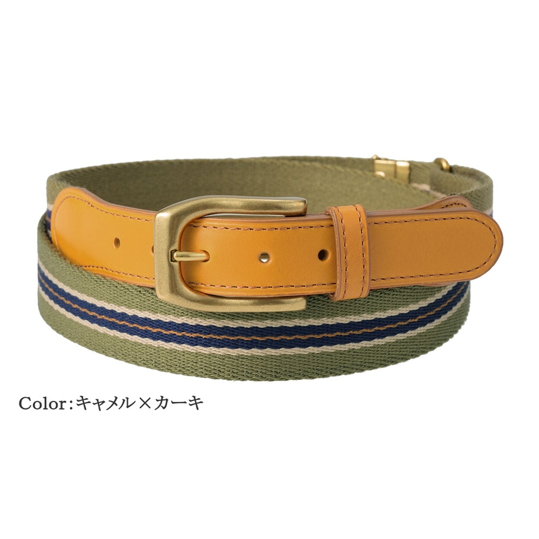 ストライプ柄のテープ帯にヌメ革の付属を組み合わせたデザインとなっており、革部分は使い込んでいく程に馴染み、経年変化を楽しめます。