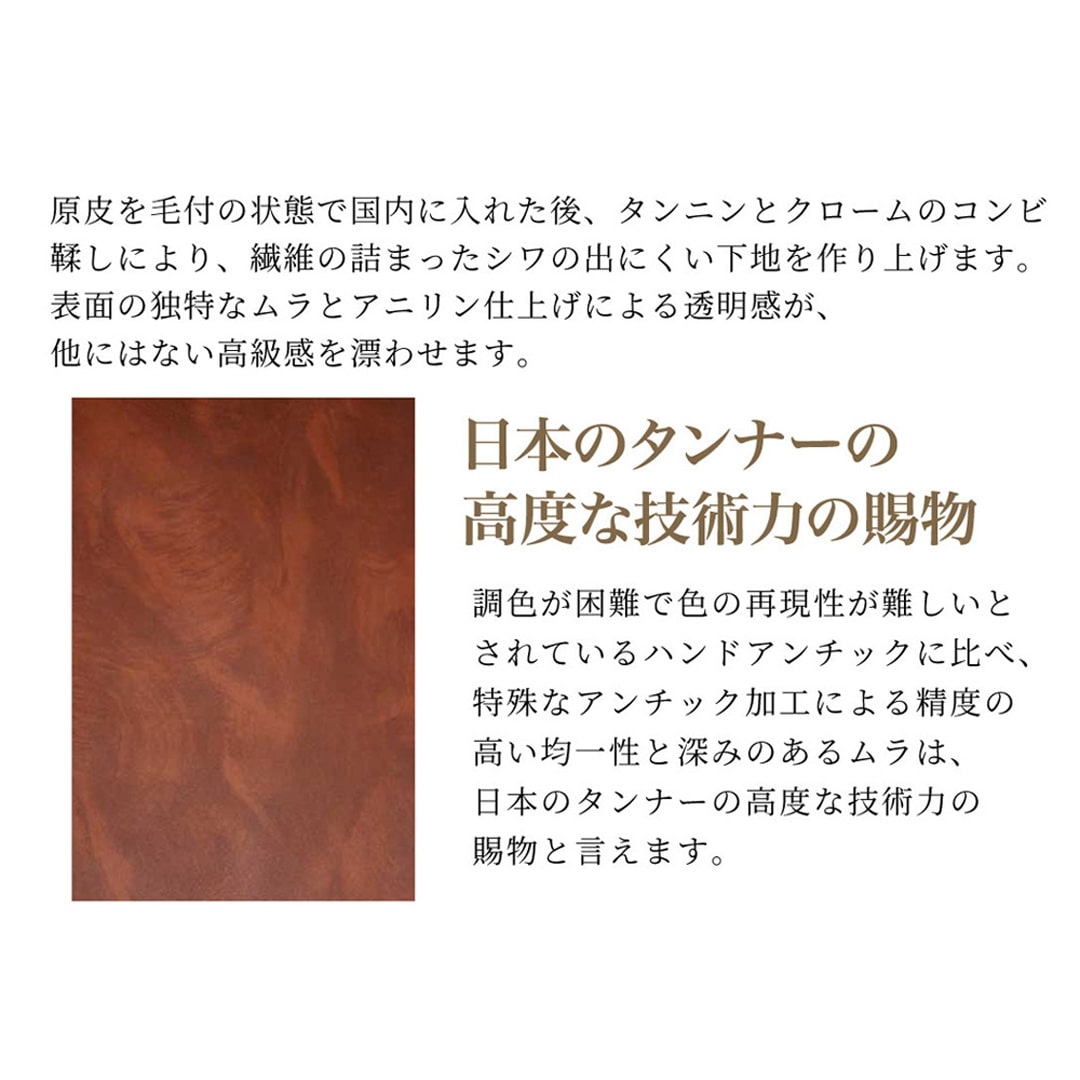 原皮にはキップ素材を使用しており、タンニンとクロームのコンビ鞣しにより、繊維の詰まったシワの出にくい下地を作り上げ 表面にはグレージングをかけて、イタリア製の薬品にてナチュラルなアンティーク仕上げをしています。