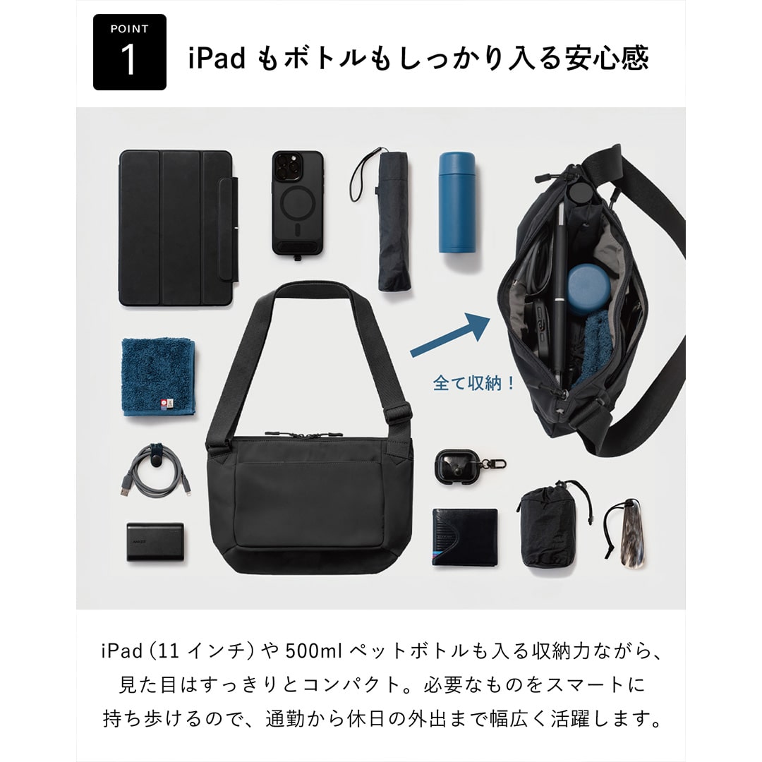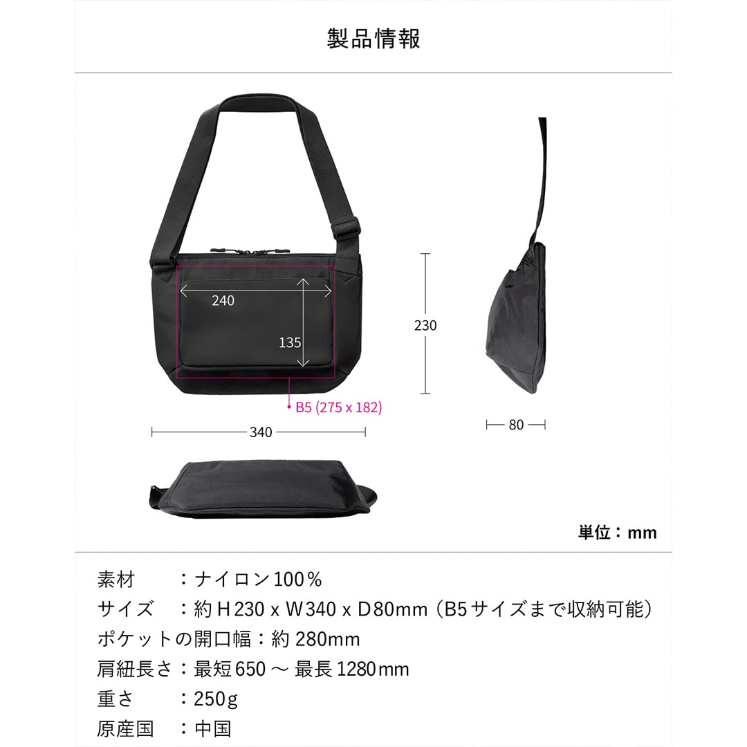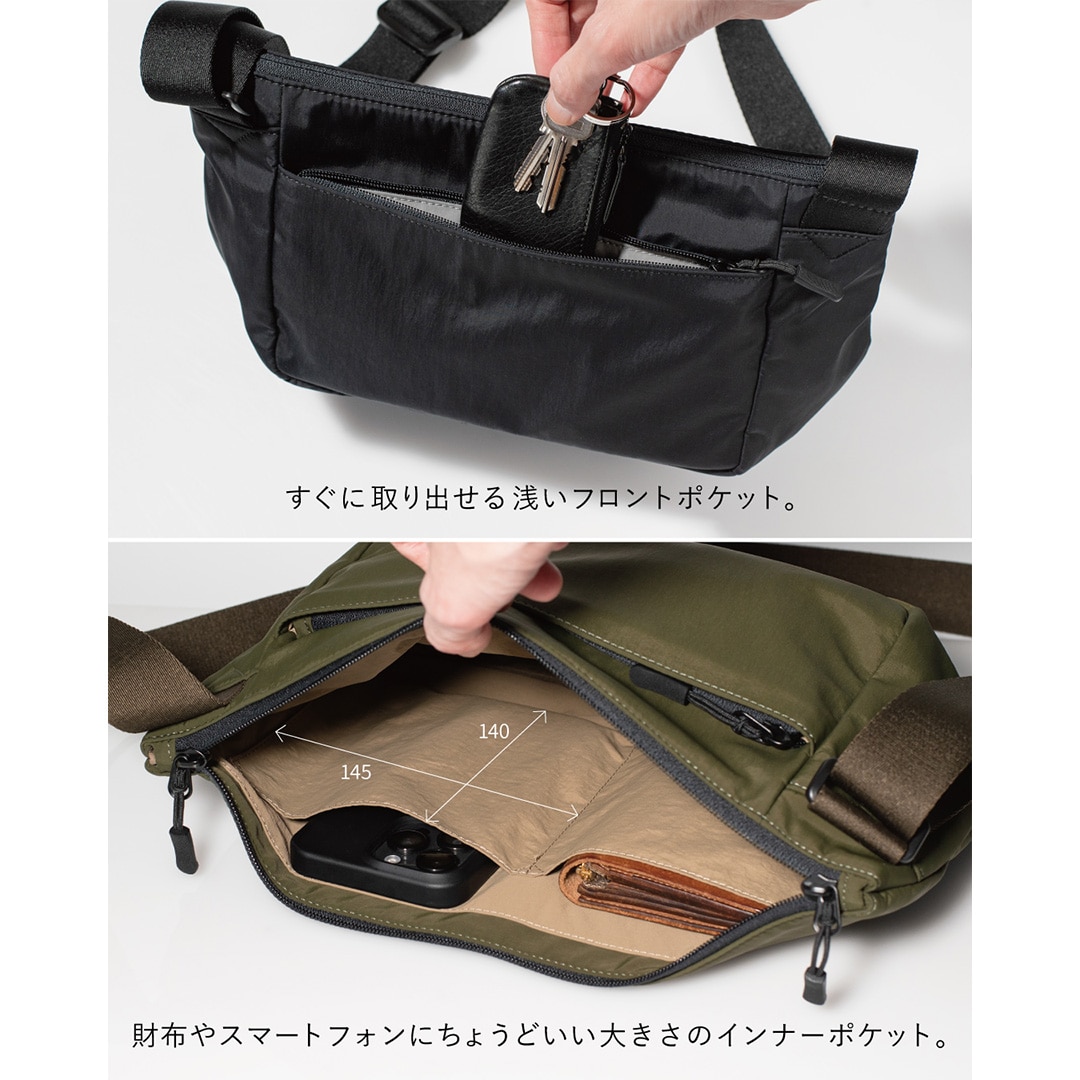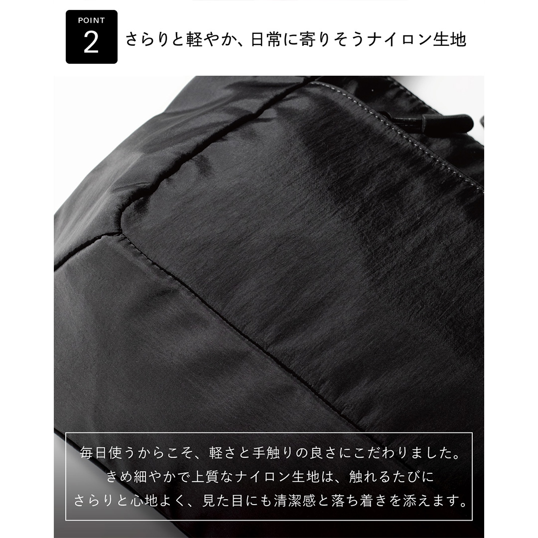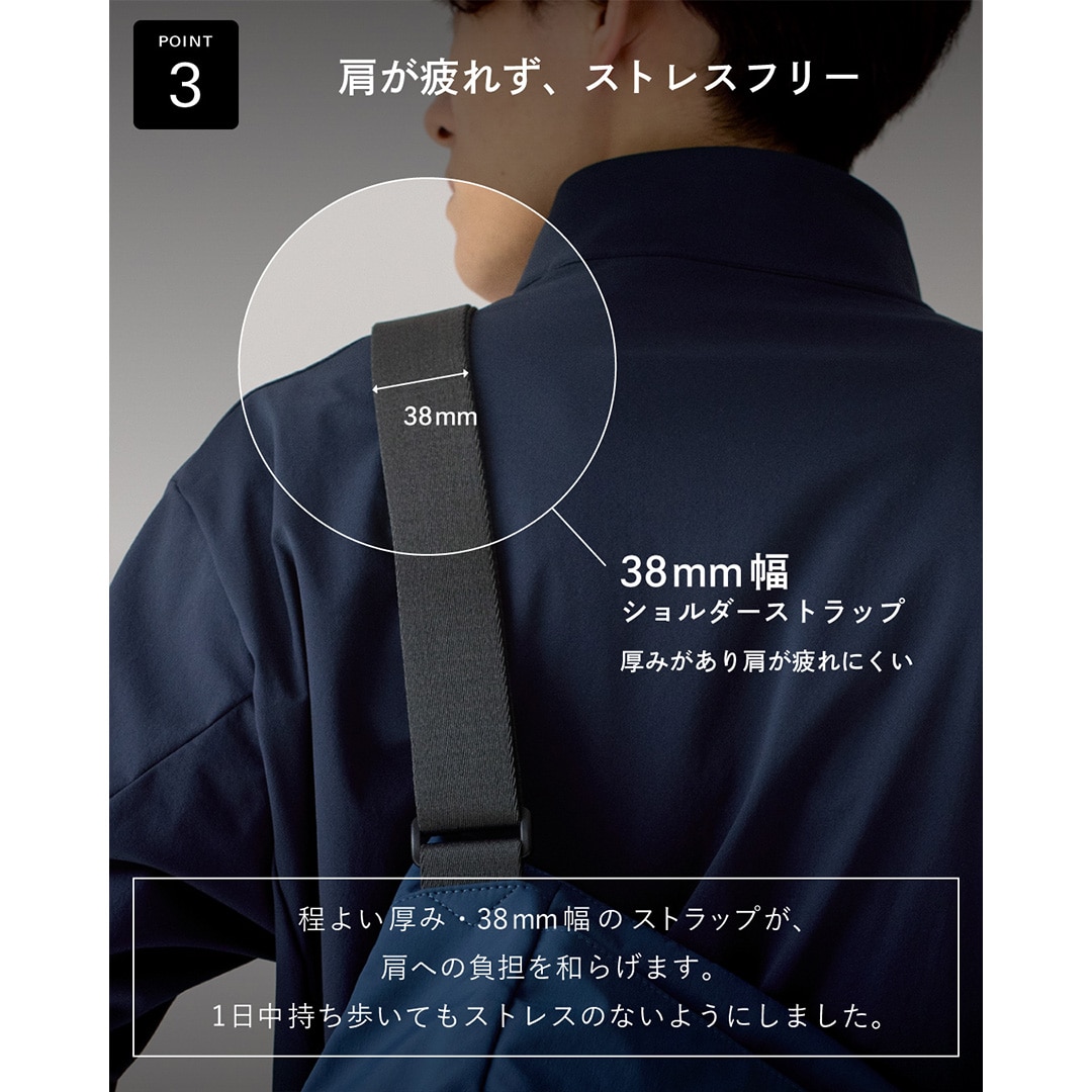 一日中持ち歩いても疲れない超軽量の250g! 底面を傾けた独自構造は物をしっかり入れても体にフィットし、 スマートな印象を与えてくれます。