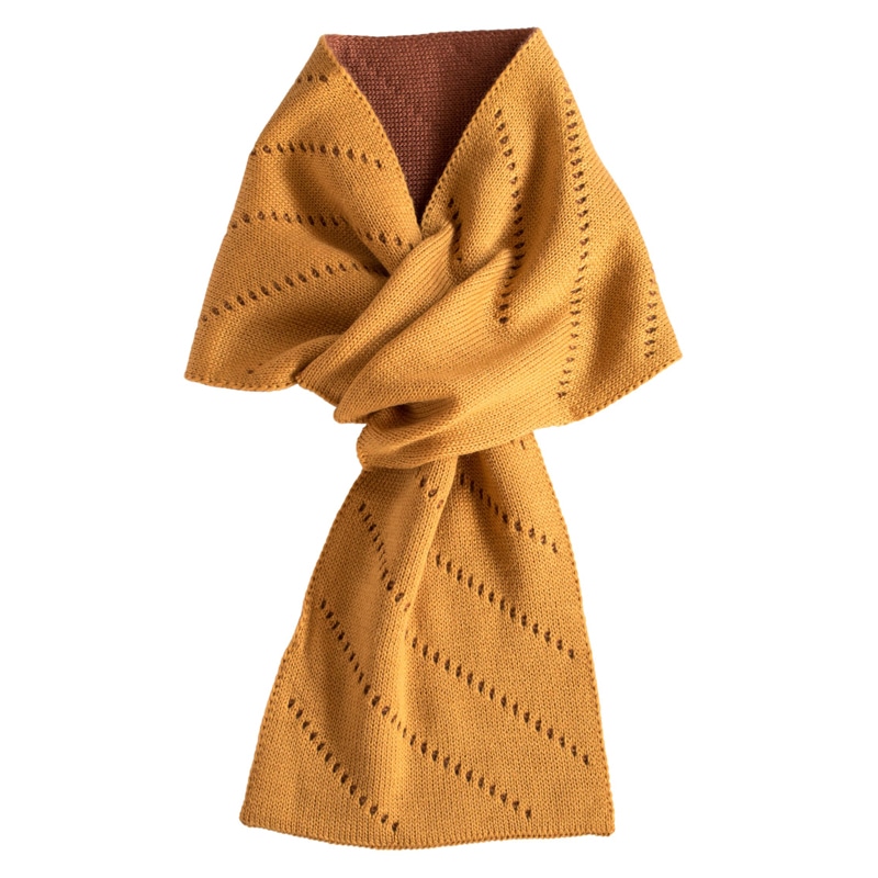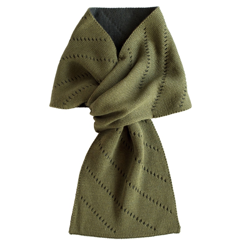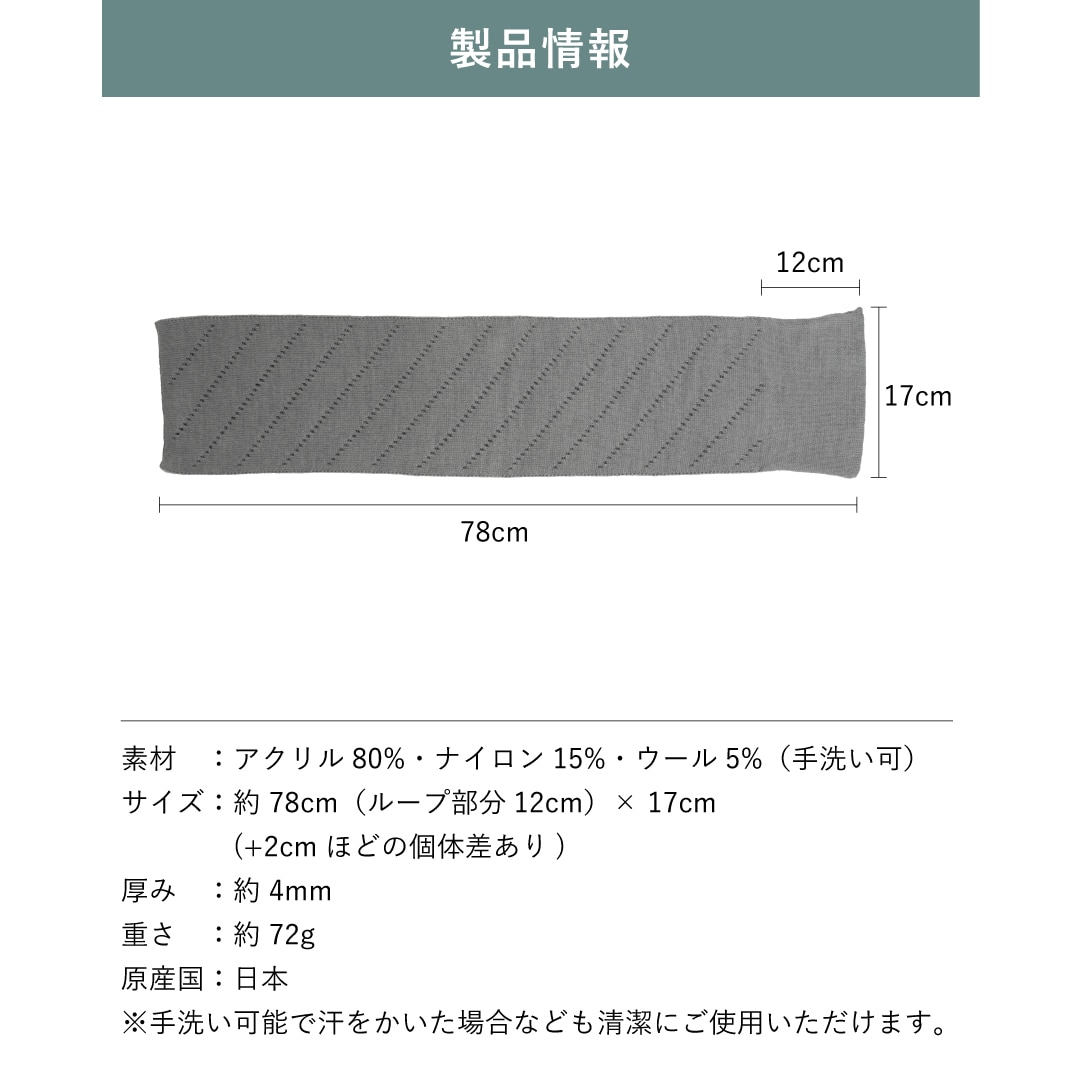 シンプルに着こなし、コンパクトに収納、そして格好良く。使い易さを追求したマフラーの形がこのミニマフラーです。 大人の男性をイメージし、深く落ち着いた配色の糸を使用。レジメンタルストライプ柄を編み目だけで作り、ふんわりとあたたかみが感じられる1枚に。肌触りも優しく、秋冬にかかせないアイテムです。