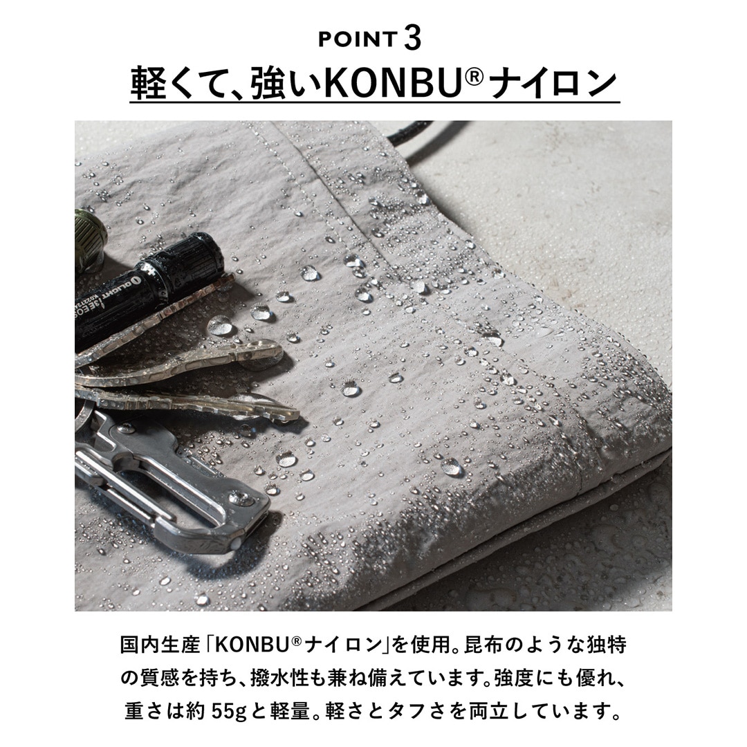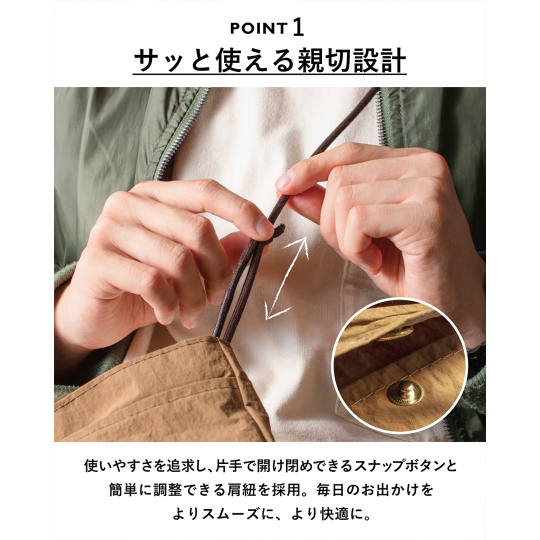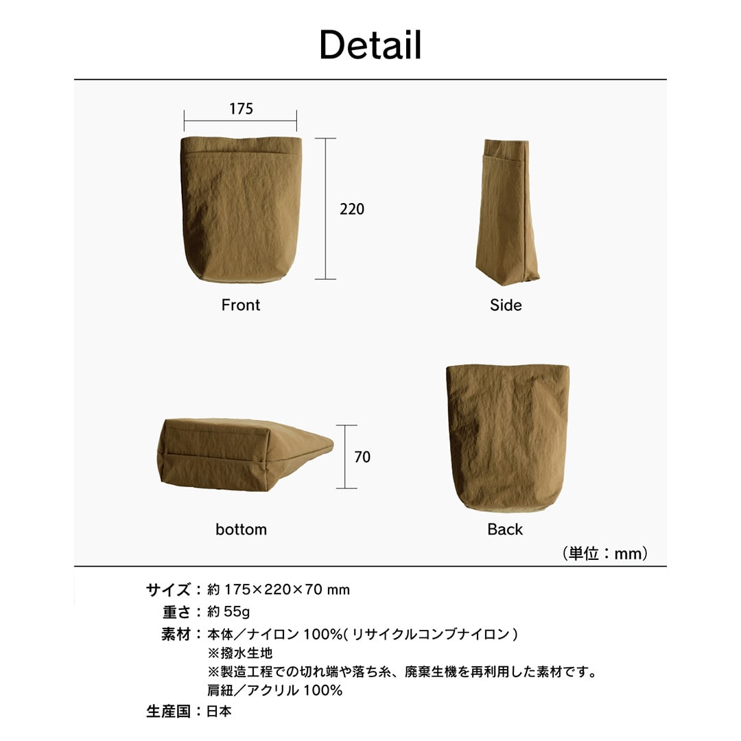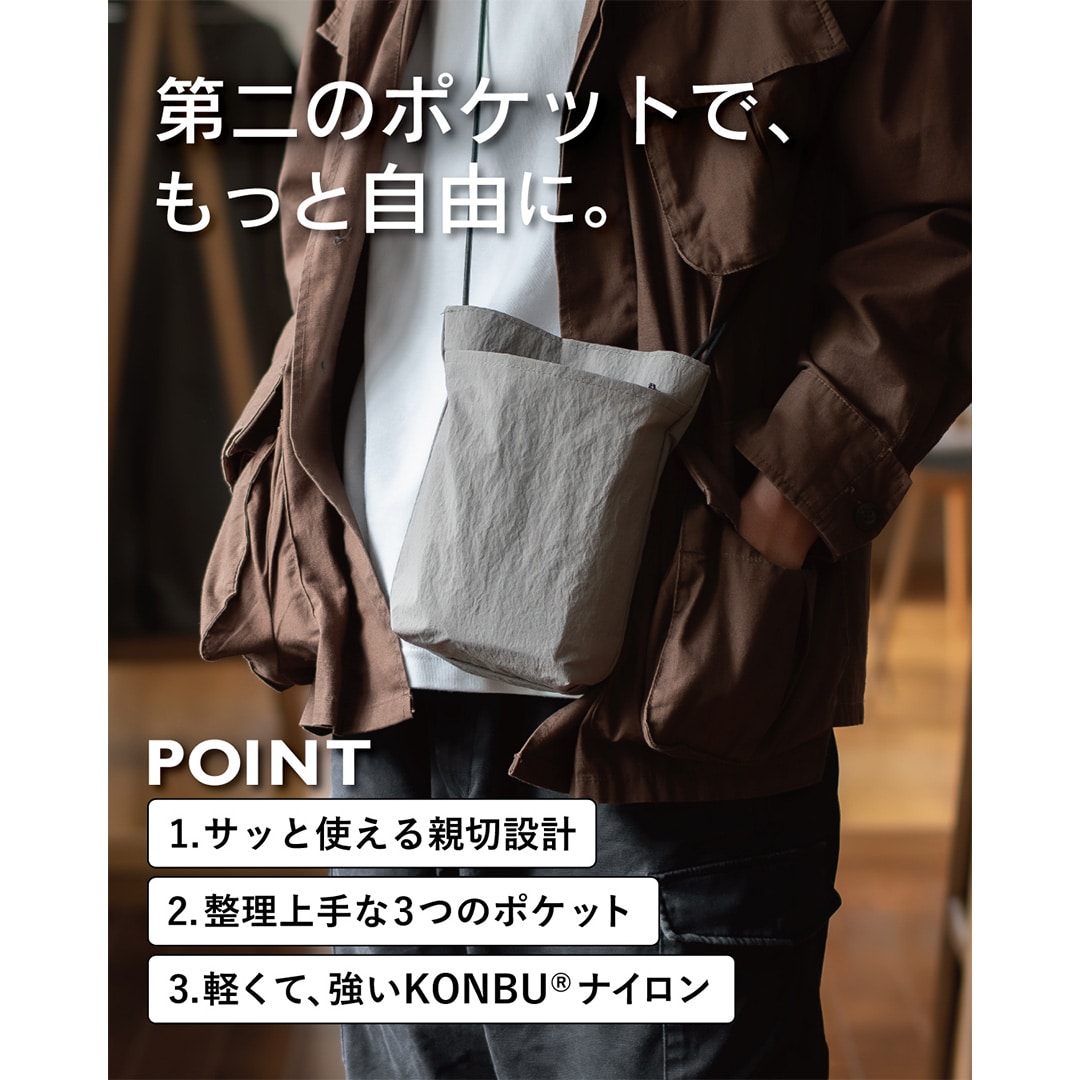 ちょっとしたお出かけにピッタリのミニショルダー。 毎日のお出かけをよりスムーズに、より快適に。 ・素材:本体/ナイロン 100%(リサイクルコンブナイロン) ※撥水生地 ※製造工程で切れ端や落ち糸、廃棄生機を再利用した素材です。 肩紐/アクリル100% ・本体ナイロン100% ・サイズ:約 175 × 220 × 70[mm] ・重さ:約55g ・原産国:日本