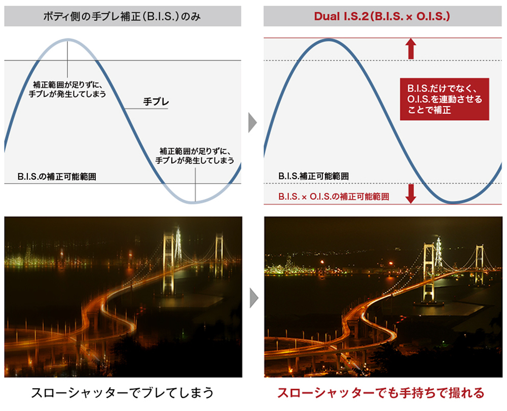 Dual I.S.2対応 ボディ(B.I.S.)5軸、レンズ(O.I.S.)2軸による手ブレ補正が7段の高い補正効果を発揮