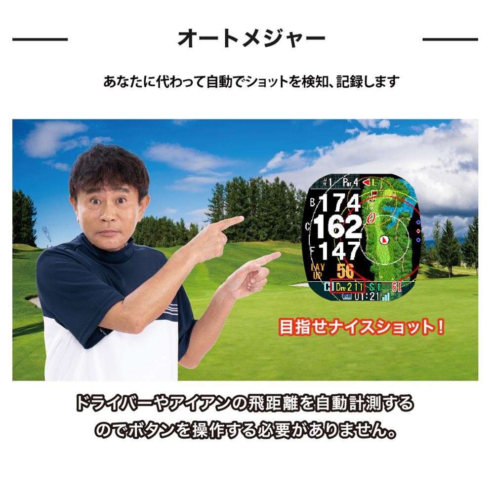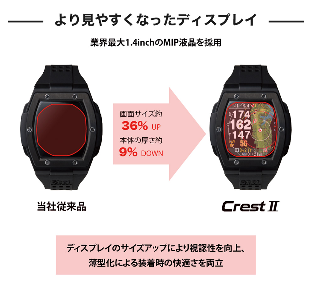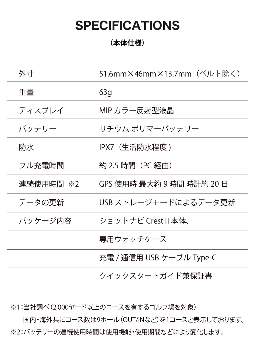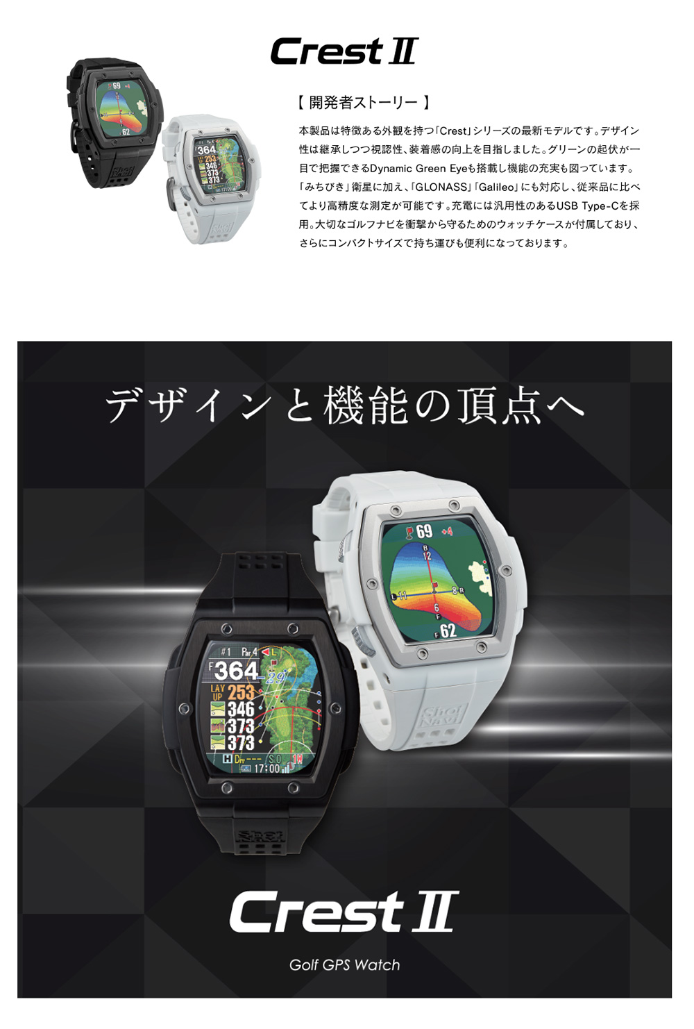 Shot Navi Crest II デザイン性や品質、設計など細部までこだわり抜いたCrestシリーズに待望のハイスペックモデルが誕生 ・超高精度『マルチ衛星ナビ』搭載! ・腕時計タイプ業界最大1.4インチカラー液晶・グリーンの起伏が分かる『Dynamic Green Eye』 ・特許取得済『フェアウェイナビ』 ・自動飛距離計測『オートメジャー』 ・競技モード搭載(高低差ON/OFF切替) ・業界最多国内100%、海外6万コース対応 ・高低差を加味した目安距離表示 ・安心の日本製 【製品仕様】 ●サイズ…51.6×46×13.7mm ●重量…63g ●ディスプレイ…MIPカラー反射型液晶 ●バッテリー…リチウムポリマーバッテリー ●防水…IPX7相当(生活防水程度) ●充電時間…約2.5時間(PC経由) ●連続使用時間…GPS使用時最大約9時間、時計約20日間 ●データ更新…USBストレージモード