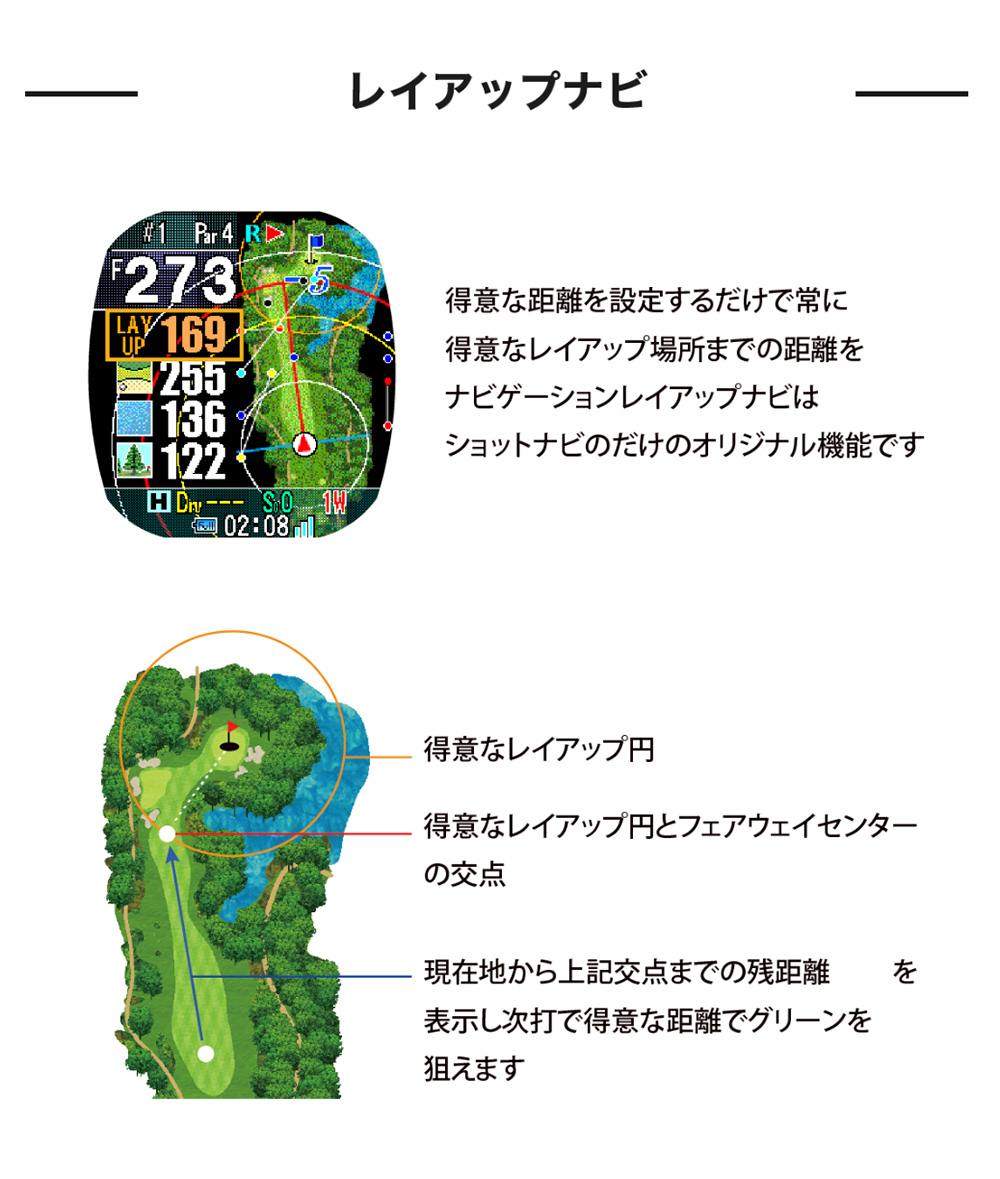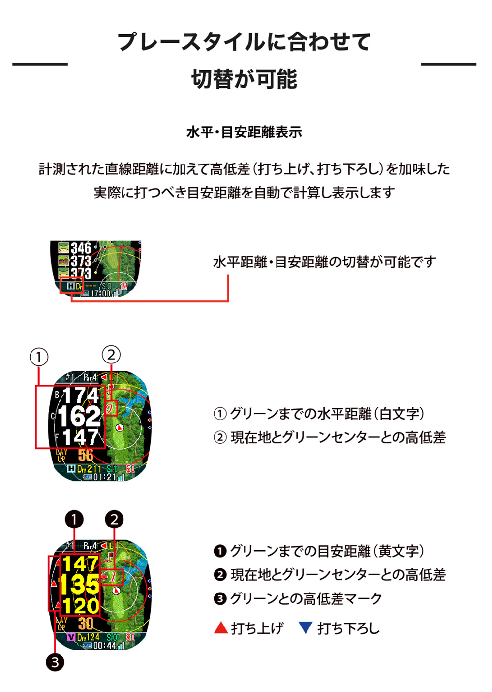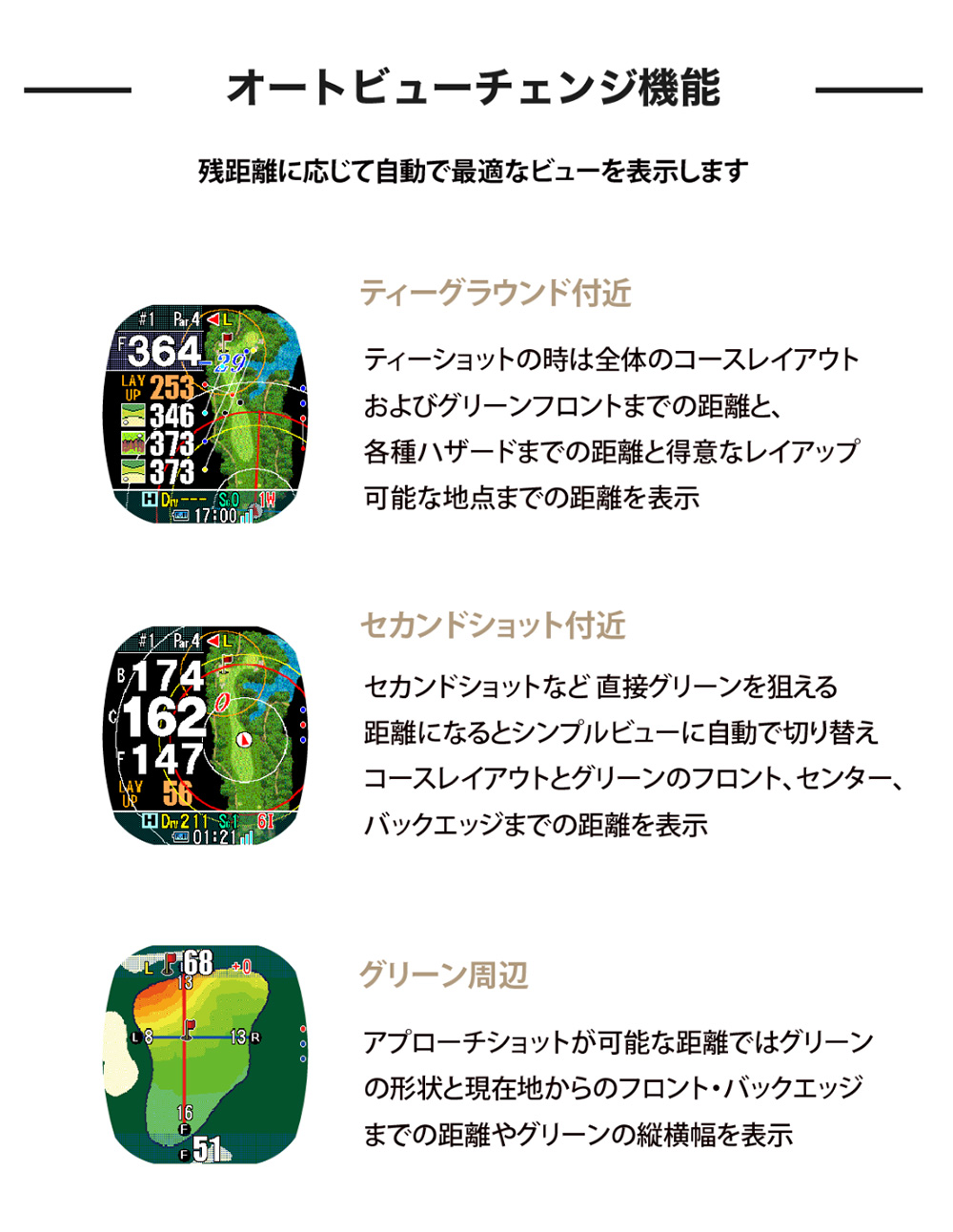 Shot Navi Crest II デザイン性や品質、設計など細部までこだわり抜いたCrestシリーズに待望のハイスペックモデルが誕生 ・超高精度『マルチ衛星ナビ』搭載! ・腕時計タイプ業界最大1.4インチカラー液晶・グリーンの起伏が分かる『Dynamic Green Eye』 ・特許取得済『フェアウェイナビ』 ・自動飛距離計測『オートメジャー』 ・競技モード搭載(高低差ON/OFF切替) ・業界最多国内100%、海外6万コース対応 ・高低差を加味した目安距離表示 ・安心の日本製 【製品仕様】 ●サイズ…51.6×46×13.7mm ●重量…63g ●ディスプレイ…MIPカラー反射型液晶 ●バッテリー…リチウムポリマーバッテリー ●防水…IPX7相当(生活防水程度) ●充電時間…約2.5時間(PC経由) ●連続使用時間…GPS使用時最大約9時間、時計約20日間 ●データ更新…USBストレージモード