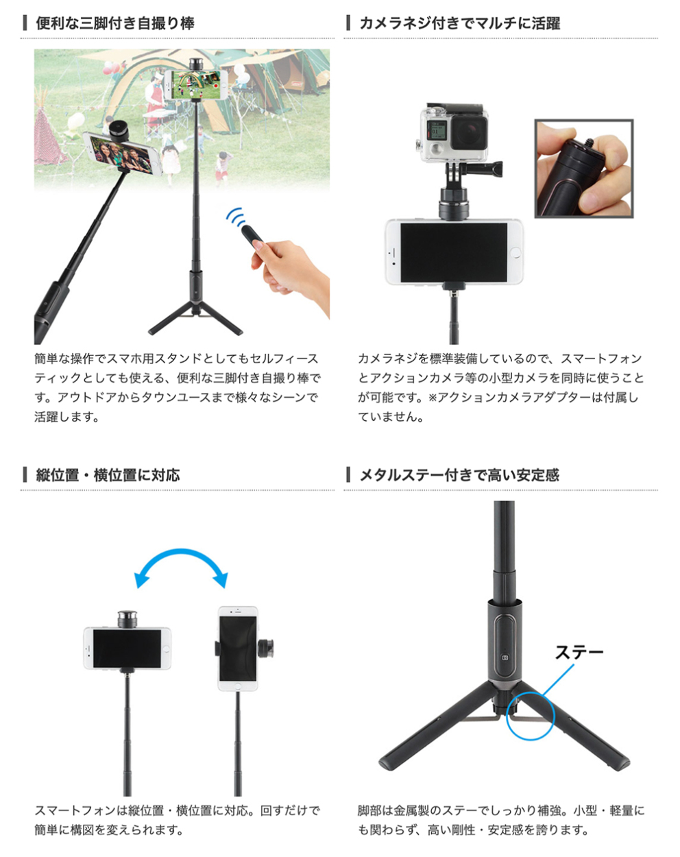 ■全高:840mm(自撮棒時:823mm) ■最低高:240mm ■縮長:215mm ■外径:30mm(上部台座・グリップとも) ■段数:8段 ■質量:182g ■推奨積載質量:350g ■対応スマホ:幅:56~80mm、厚み10mm以内 ■カメラネジ:UNC1/4(細ネジ) ■主な材質 :ABS+PC(グリップ) ■電波規格 :Bluetooth 3.0 ■電波周波数:2.4gHz ■電波到達範囲:半径約10m※障害物が無い場合 ■使用可能回数:約2万回※満充電時 ■連続待機時間:約6ヶ月※満充電時 ■充電端子 :Micro USB ■充電ケーブル:USB-Micro USB(300mm) ■充電時間 :約1時間