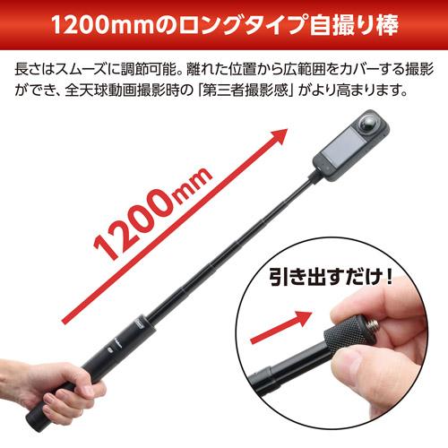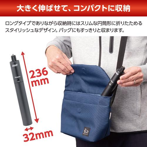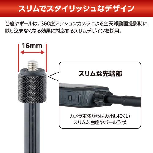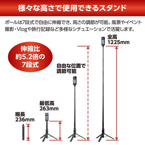 全高:約1225mm(スタンド時) 縮長:約236mm グリップ径:約31.5mm 段数/脚径:6段/20.0/18.3/16.4/14.6/12.8/11.0/9.3mm 質量:約223g 推奨積載質量:300g カメラネジ:UNC1/4(細ネジ) 対応スマートフォンサイズ:幅:70~100mm 厚み:13mmまで 「見えない自撮り棒」対応機種 Insta360 X4 Insta360 X3 Insta360 X2 Insta360 ONE RS Insta360 ONE RS 1インチ360度版 付属品:スマートフォンホルダー アクションカメラアダプター