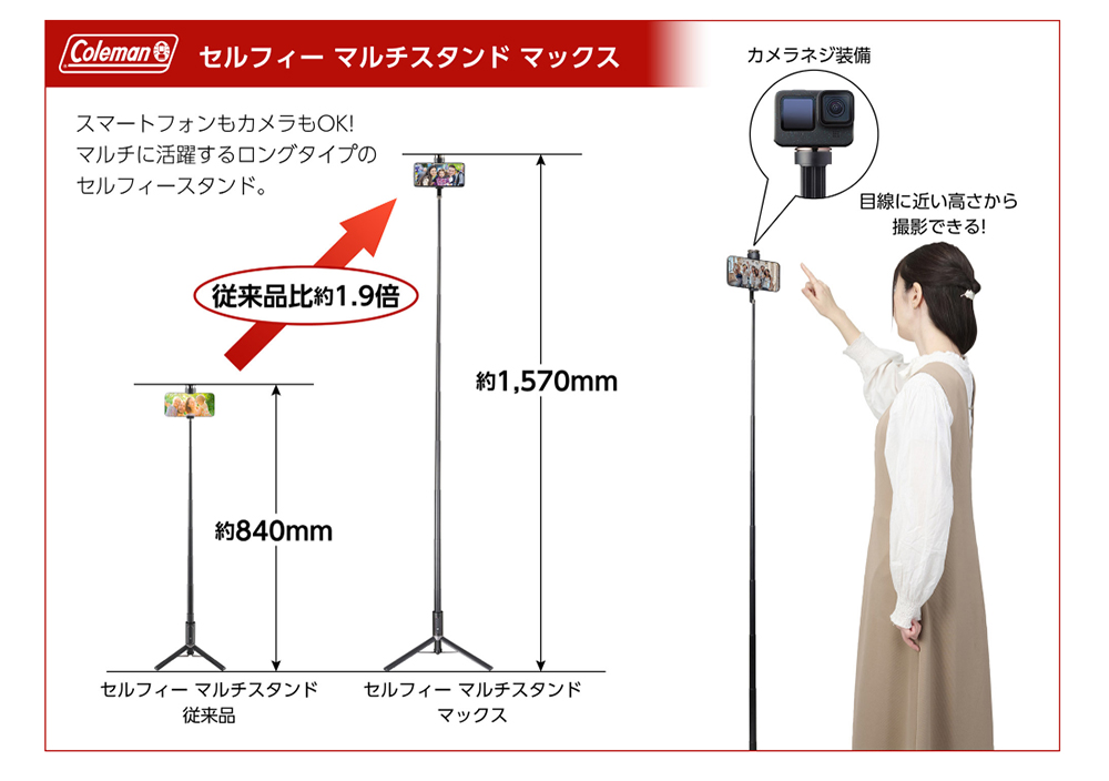 ・アングル自在のスマートフォンホルダー。 ・アクションカメラやコンパクトカメラの装着も可能。 ・簡単操作でしっかり自立するスタンドに。 ・取り外して使えるリモコンを搭載。 ・リモコンはUSBケーブルによる充電式。 ・自撮りにも最適。ロングタイプ&収納時はコンパクトに。