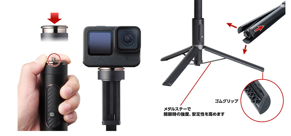 スタンドの脚部は、折りたたむと自動ロック、展開時は解除ボタンを押して広げるだけの簡単操作。強度を保つメタルステーと脚先の滑り止めグリップで、ロングタイプでも抜群の安定性を実現。様々なシーンで安心して撮影を楽しめます。