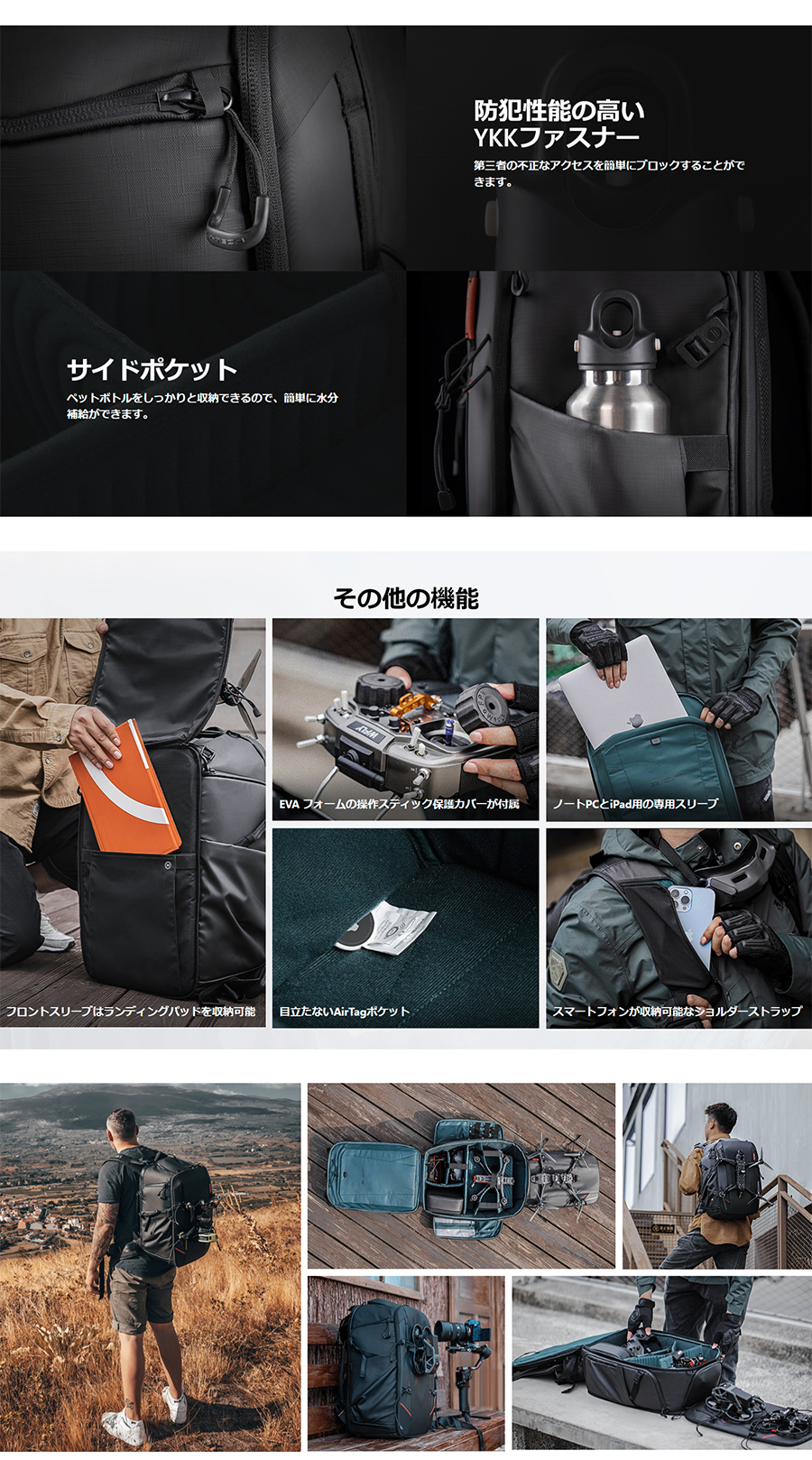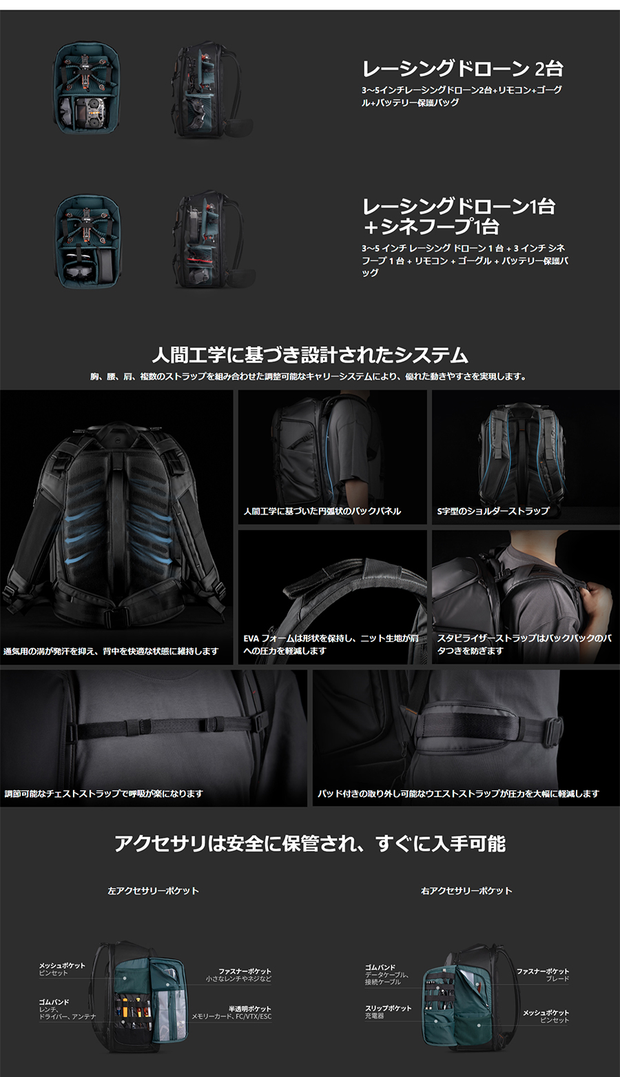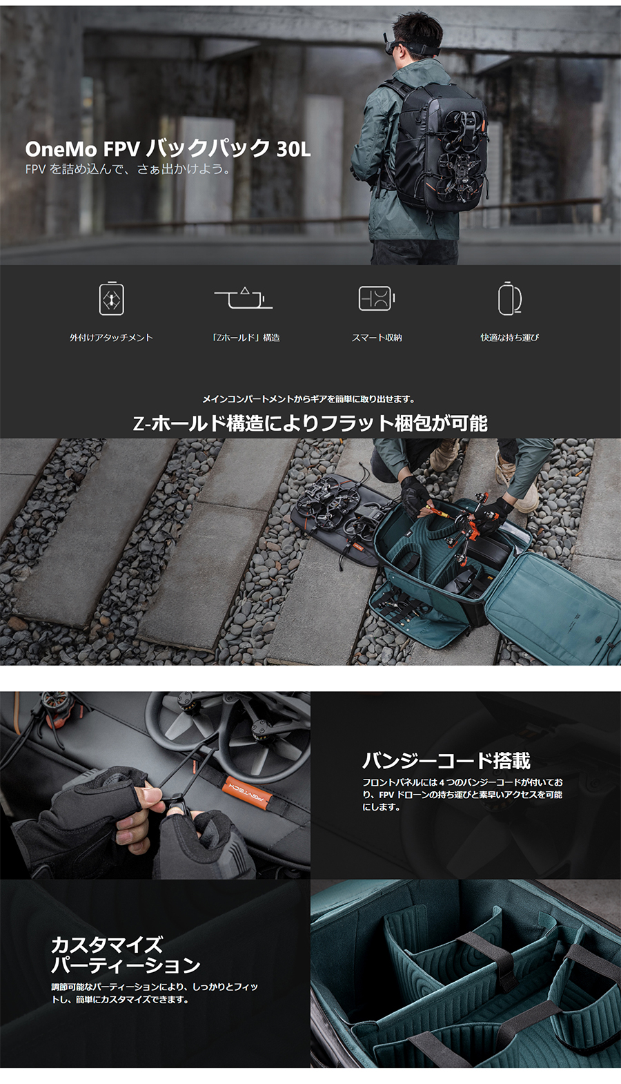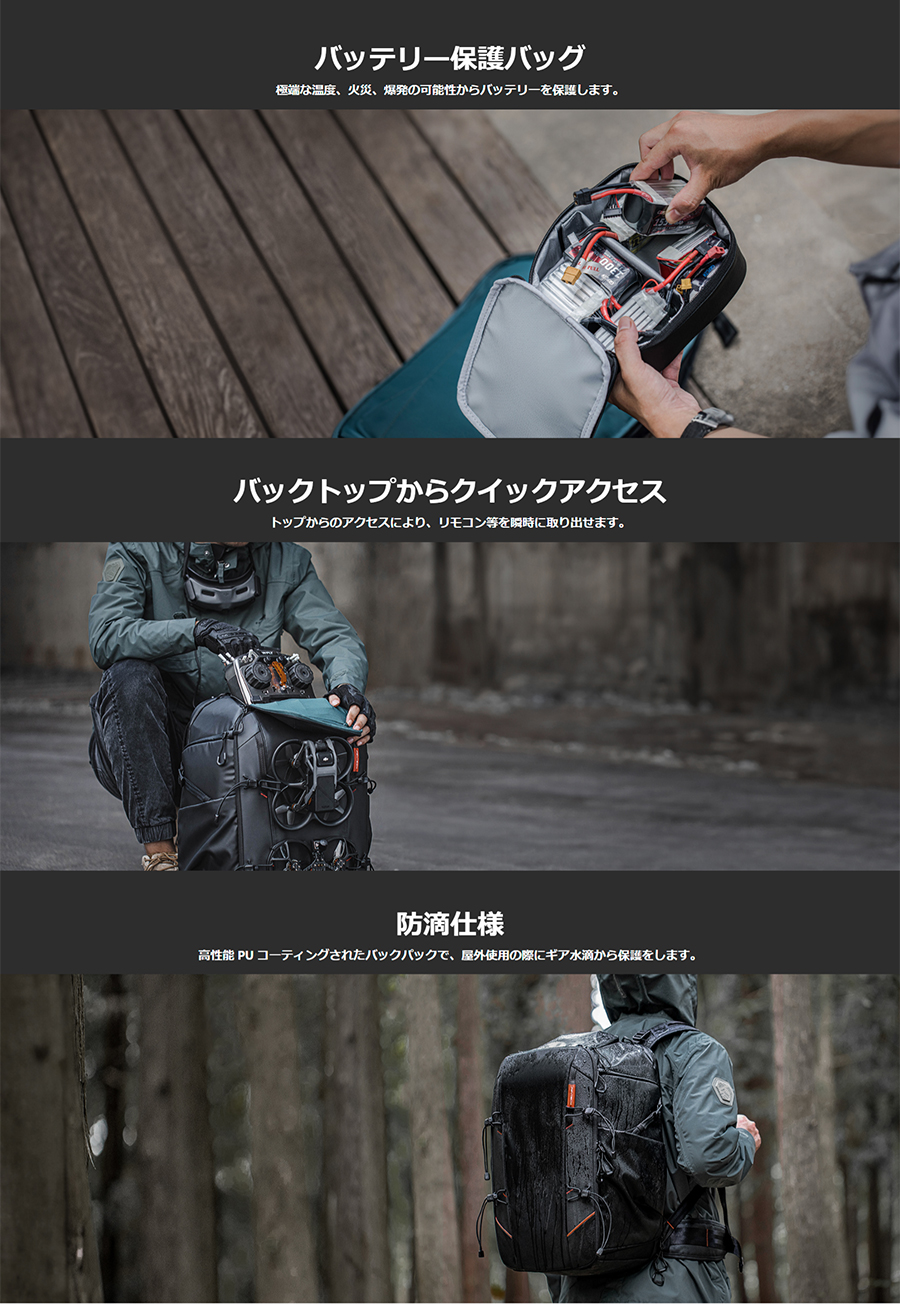OneMo Backpack (ワンモー バックパック) 30Lは、FPVドローン用に設計されたバックパックです。 高品質の防水素材を使用し、ドローンやコントローラーなどの機材をしっかりと保護します。 また、Zホールド機構により優れた収納を実現、加えてリュックサック内部にはPCやipadも同時収納可能なポケットがあり、機材と一緒に持ち運ぶことができます。 背面にはメッシュ素材を使用し、通気性も良いので、長時間の持ち運びでも快適に使用することができます。さらに、ウエストベルトや胸ベルトも付いており、重い荷物でも安定した持ち運びが可能です。 ファッション性も高く、アウトドアや旅行などにも使用できるマルチなリュックサックです。 FPVドローンだけでなく、DJI Mavicシリーズなどの汎用的な空撮ドローンにもお使いいただけます。