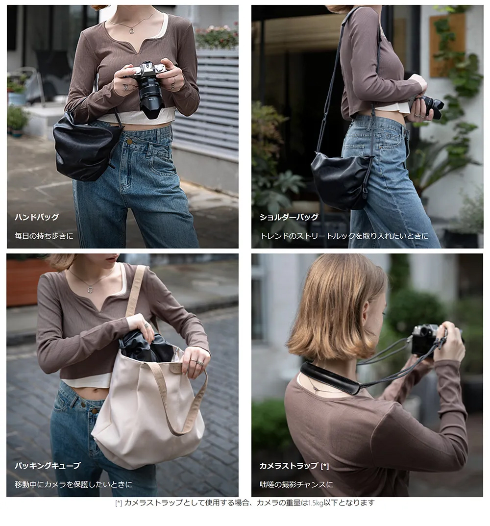 重量:200g サイズ:220mm x 60mm x 80mm 主な素材:生地 : ポリウレタン55%、ポリアミド45% / 裏地 : ポリエステル 100% 容量 1. M50やXT30のような小型ミラーレスカメラやデジタルカメラ[*] 2. GoPro、Insta360、DJI Actionシリーズなどのアクションカメラ *例 1. ボディとレンズの長さの合計が16cm未満の小型から中型のミラーレスカメラ[*] 2. GoPro、Insta360、DJI Actionシリーズなどのアクションカメラ 例 SONY α7R+SEL24F14GM α7+SEL2470Z α7C+SEL55F18Z α6400+18-135 F3.5-5.6 Nikon- Z6+Z 24-70 f/2.8 S Zfc+ Z DX 16-50 Canon R50+RF24-105 RP+RF24-105 R100+RF-S18-45 200D+18-55 FUJI XT3/4/5+XF18-135 XH2+XF16-55 XS20+XF18-55 Xpro3+XF16-55