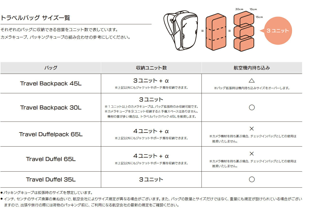 ※トラベルバックパック30L へ収納する場合は、バッグを拡張する必要があります(X スモールを除く)
