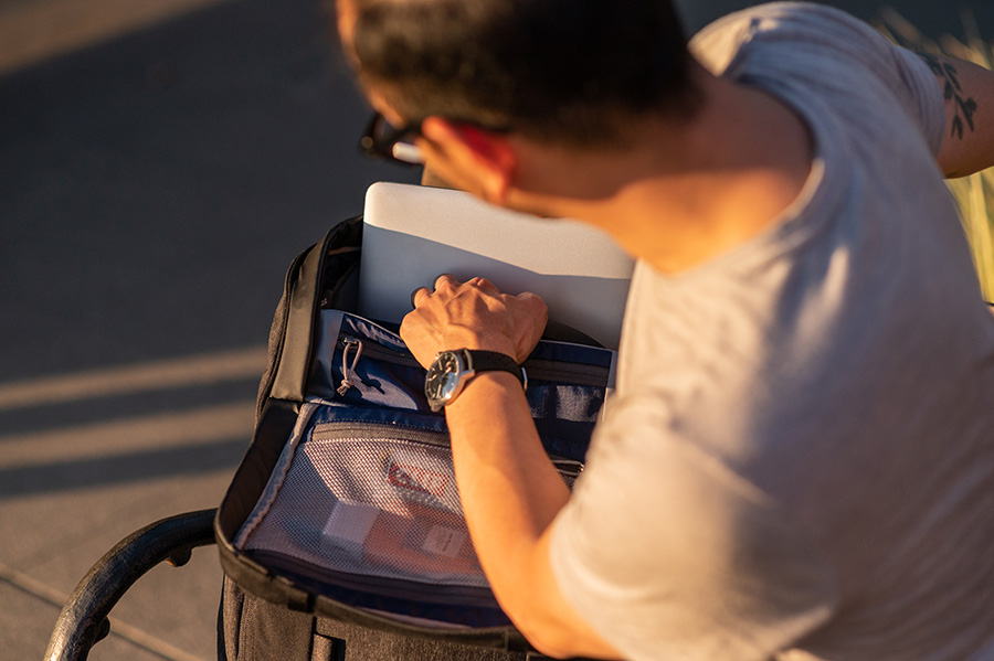 その他にも、バッグ左側上部のジッパーポケットにはセキュリティケーブルが内蔵され、バッグ内部には充電などに便利なケーブル用のパススルーが付いています。