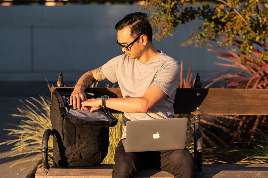 すっきりとしたデザインで日々の移動や旅行はもちろん、別売りのスタッシュマスターと組み合わせれば、カメラバッグとしても使用できます(※1)。