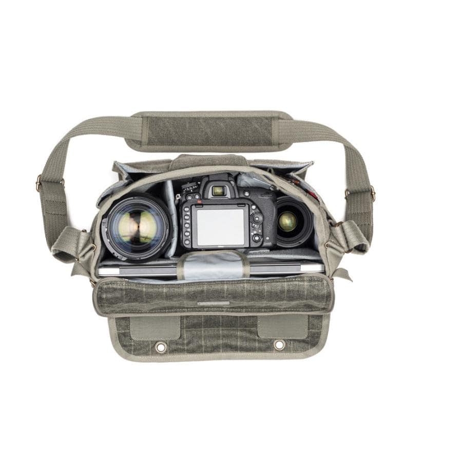 24-70mm F2.8を装着した中型一眼レフと、70-200mm F2.8を収納できます。また、ストロボ、10インチのタブレット、13インチのノートパソコンを収納できます。