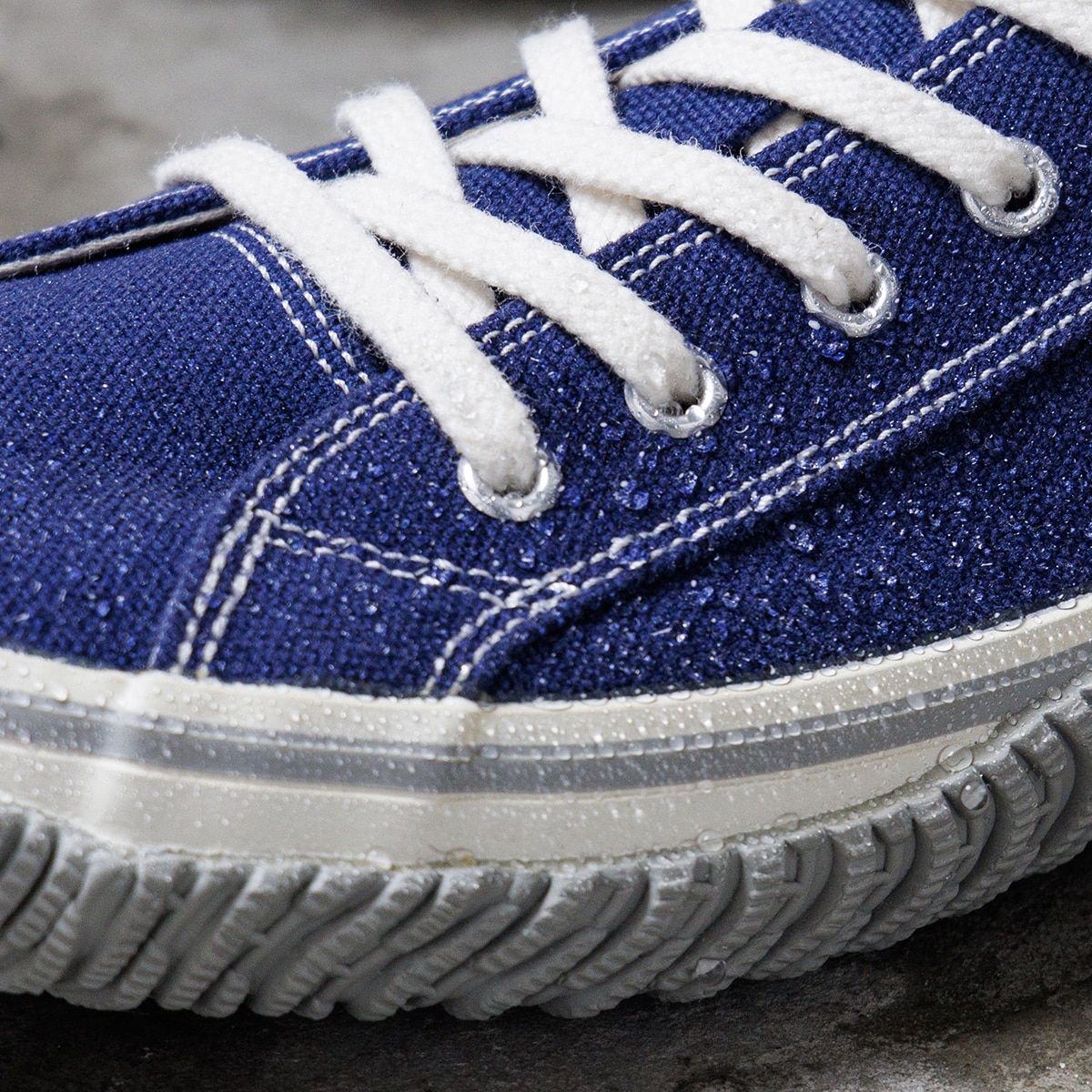 アッパー:撥水とバイオウォッシュ加工を施した8号帆布を使用。味のある風合いで、初めて履いた瞬間から柔らかな足当たりであり、雨などの水滴も弾きます。フォクシングテープ:適度な柔らかさと剛性を兼ね備えています。スピングル社でゴムを調合し作っています。