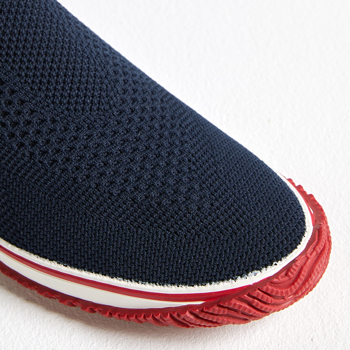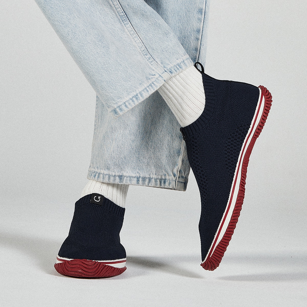 アッパー:ジャガードニットを使用。伸縮性が高いため脱ぎ履きしやすく、靴下を履いているような心地良さです。フォクシングテープ:適度な柔らかさと剛性を兼ね備えています。スピングル社でゴムを調合し作っています。