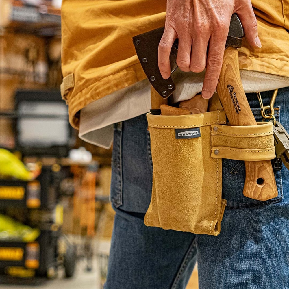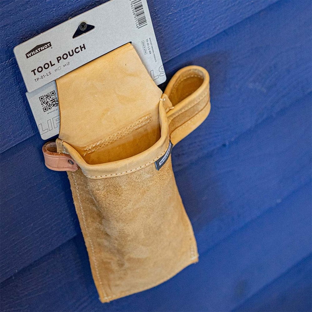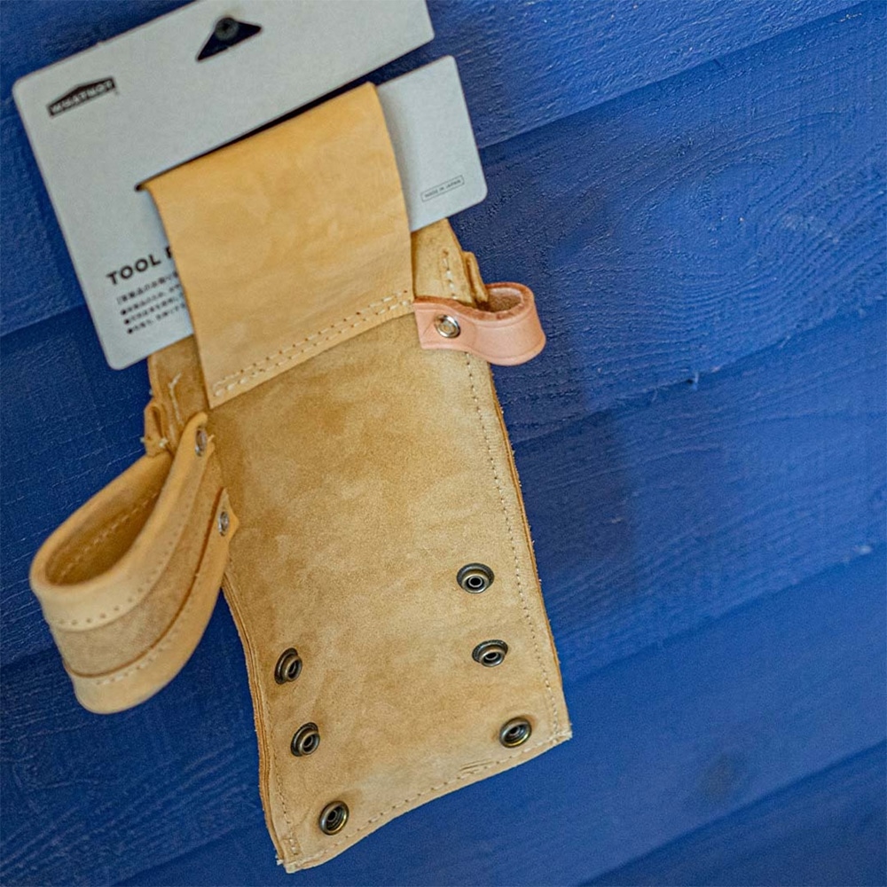 ・DIYからアウトドアまで幅広い用途でお使いいただけるワークポーチとなります。 ・デザインから材質、仕様に至るまでこだわったWHATNOTオリジナル商品です。 ▼仕様 ・サイズ(約):幅120mm×奥行300mm×高さ40mm ※ハンマループ・カラビナループ含まず ・重量(約):120g ・素材:[本体]ヌバックレザー、[ループ]ヌメ革 ・製造国:日本 ※撮影写真上の付属の各種ツールは付属しておりません。 ▼主な商品の特徴 ・ヌバックレザーを使用 表面は牛革のヌバックレザー、ループ部はヌメ革を使用しています。 エイジング(経年変化)が生じる革となりますので使い込む中での色の変化をお楽しみください。 ・ブラウン・ブルーグレーの2色展開 各カラーの風味に合わせてループ部のヌメ革はブラウンは無着色、ブルーグレーはブラックに着色しております。 ・日本国内で製造 皮革産業発祥の地である兵庫県姫路市で製造。 革の着色から裁断、縫製まで、"MADE IN JAPAN"の商品となります。 ・3段階の高さ調整が可能 長尺部の収納は背面のスナップによる3段階の高さ調整が可能です。 カッターや折り込み鋸、ペグであれば30cmまで持ち物のサイズに合わせてサイズ調整いただけます。 ・ハンマーループ・カラビナループ完備 側面左右にハンマー用ループとカラビナ用ループを完備しております。 上記に限定した専用設計ではありませんので、お好みに合わせてご自由にご活用ください。 ・腰袋タイプは2タイプ(前面収納有無) 腰袋タイプは前面収納なしの長尺収納のみと前面収納ありの2タイプあります。 長尺は背面収納、小物は前面収納といった用途でもお使いいただけます。 ▼注意事項 ・革製品のため、水や油汚れには弱く、ご使用の際はご注意ください。 ・天然皮革を使用しているため、スレや色ムラがある場合がございます。 ・あらかじめご了承の上、ご購入いただきますよう宜しくお願いいたします。