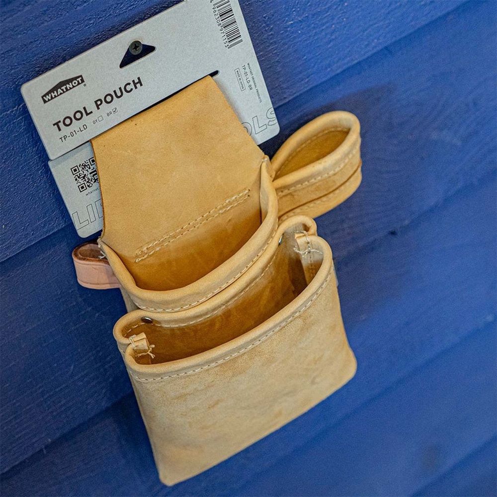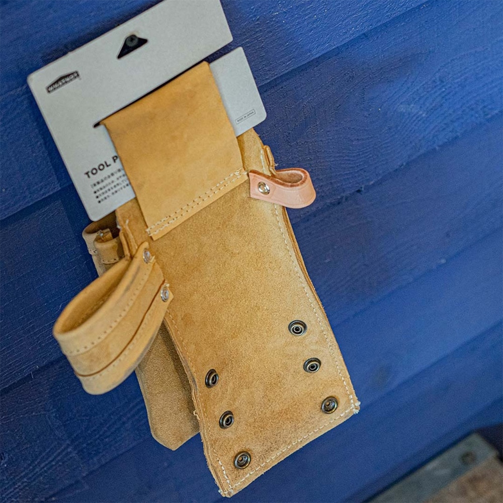 ・DIYからアウトドアまで幅広い用途でお使いいただけるワークポーチとなります。 ・デザインから材質、仕様に至るまでこだわったWHATNOTオリジナル商品です。 ▼仕様 ・サイズ(約):幅150mm×奥行300mm×高さ90mm ※ハンマループ・カラビナループ含まず ・重量(約):220g ・素材:[本体]ヌバックレザー、[ループ]ヌメ革 ・製造国:日本 ※撮影写真上の付属の各種ツールは付属しておりません。 ▼主な商品の特徴 ・ヌバックレザーを使用 表面は牛革のヌバックレザー、ループ部はヌメ革を使用しています。 エイジング(経年変化)が生じる革となりますので使い込む中での色の変化をお楽しみください。 ・ブラウン・ブルーグレーの2色展開 各カラーの風味に合わせてループ部のヌメ革はブラウンは無着色、ブルーグレーはブラックに着色しております。 ・日本国内で製造 皮革産業発祥の地である兵庫県姫路市で製造。 革の着色から裁断、縫製まで、"MADE IN JAPAN"の商品となります。 ・3段階の高さ調整が可能 長尺部の収納は背面のスナップによる3段階の高さ調整が可能です。 カッターや折り込み鋸、ペグであれば30cmまで持ち物のサイズに合わせてサイズ調整いただけます。 ・ハンマーループ・カラビナループ完備 側面左右にハンマー用ループとカラビナ用ループを完備しております。 上記に限定した専用設計ではありませんので、お好みに合わせてご自由にご活用ください。 ・腰袋タイプは2タイプ(前面収納有無) 腰袋タイプは前面収納なしの長尺収納のみと前面収納ありの2タイプあります。 長尺は背面収納、小物は前面収納といった用途でもお使いいただけます。 ▼注意事項 ・革製品のため、水や油汚れには弱く、ご使用の際はご注意ください。 ・天然皮革を使用しているため、スレや色ムラがある場合がございます。 ・あらかじめご了承の上、ご購入いただきますよう宜しくお願いいたします。