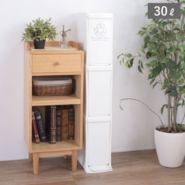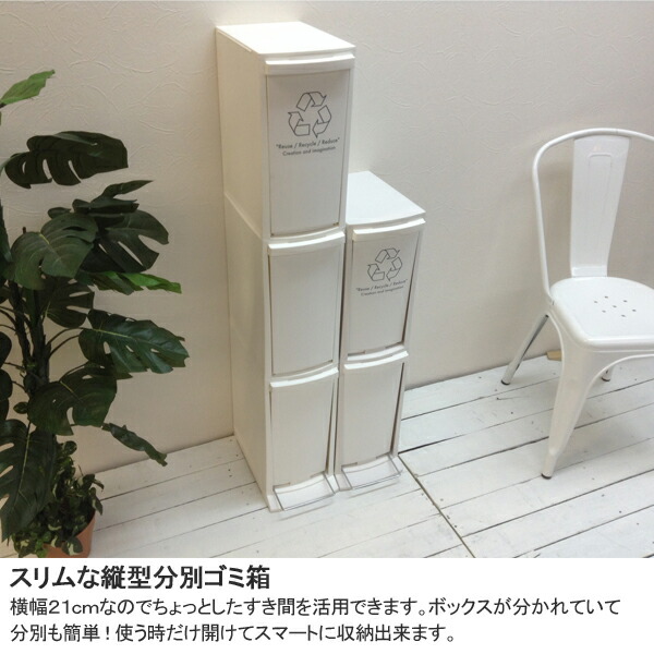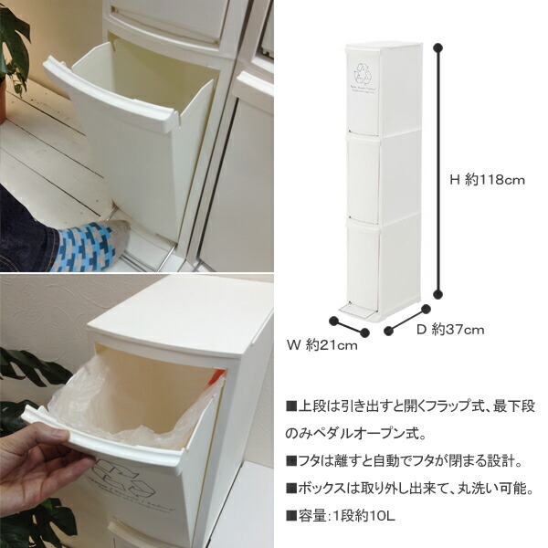 サイズ約W21×D37×H118cm容量約30L(10L×3)重量(約)4.3kg材質ポリプロピレン製造元東谷生産国日本サイズ約W21×D37×H118cm容量約30L(10L×3)重量(約)4.3kg材質ポリプロピレン製造元東谷生産国日本スリムな縦型分別ごみ箱横幅21cmのスリム形状。ちょっとした隙間にも置くことができるのでスペースを有効活用できます。ボックスが3段に分かれていて分別も簡単です。使う時だけ開けてスマートに収納できます。● 上段は引き出すと開くフラップ式、最下段のみペダルオープン式。● フタは離すと自動で閉まる設計。● ボックスは取り外して丸洗い可能。● 容量は1段あたり10L。