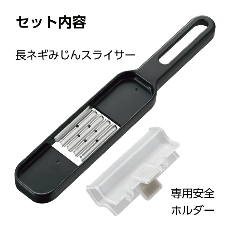 サイズ約41×14×238mm(ホルダー抜きのサイズ)重量約36g(ホルダー抜き)材質スライサー,ホルダー:AS樹脂(耐熱温度90℃/耐冷温度-30℃)樹脂バネ:シリコーンゴム(耐熱温度150℃/耐冷温度ー20℃)切り刃:ステンレススチール製造元曙産業生産国日本長ネギのみじん切りが安全に素早くできるスライサー長ネギのみじん切りがすぐにできるスライサー。長ネギに安全ホルダーをセットして、スライスするだけ。まな板や包丁を出さずに、あっという間にみじん切りが出来上がります。チャーハン、油淋鶏、餃子、麻婆豆腐などの中華料理はもちろん、冷奴や麺類の薬味にも大活躍です。長ネギ専用の安全ホルダー付きで、安全に調理ができます。安全ホルダーはスライサーにセットして収納できます。長ネギみじんスライサーの使い方1.長ネギの根元側から数cmずらして安全ホルダーを挟み、中心を持ちます。2.前後に動かし、スライスします。スライスが進み切り刃にホルダーが当たりそうになったら上にずらして使用します。※ご使用の際は、必ず安全ホルダーを使用してください。※安定感があることを確認しながらスライスしてください。