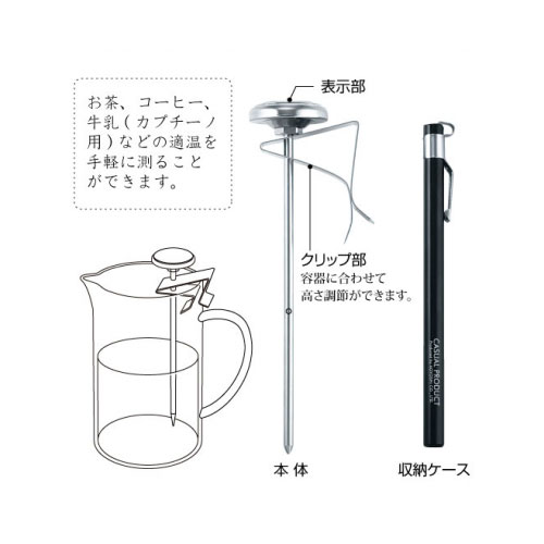 サイズφ31×L141mm材質アクリル,18-8ステンレス,ABS商品説明コーヒーや紅茶をおいしくいれるには、お湯の温度も重要です。手軽にお湯の温度が計れる温度計。お茶、コーヒー、牛乳(カプチーノ用)などの適温を測る時に便利です。クリップ付きなので容器に挟んで固定できます。製造青芳製作所備考中国生産●CASUAL PRODUCT