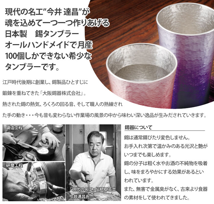 材質本体:錫桐箱入りサイズ約 φ6.5 × 10.0cm容量約 200ml商品重量約260g商品説明現代の名工”今井 達昌”が魂を込めて一つ一つ作りあげる日本製錫タンブラー。オールハンドメイドで月産100個しかできない希少なタンブラーです。江戸時代後期に創業し、錫製品ひとすじに鍛錬を重ねてきた「大阪錫器株式会社」熱された錫の熱気、ろくろの回る音、そして職人の熟練された手の動き・・・今も昔も変わらない作業場の風景の中から味わい深い逸品が生みだされていきます。錫器について錫は通常錆びたり変色しません。お手入れ次第で温かみのある光沢と艶がいつまでも楽しめます。錫の分子は粗く水やお酒の不純物を吸着し、味をまろやかにする効果があるといわれています。また、無害で金属臭がなく、古来より食器の素材をして使われてきました。製造大阪錫器備考●日本製●電子レンジ、食洗機使用不可●冷凍保存不可●溶解温度が約230℃と低いため、直火などではご使用いただけません。錫製タンブラー シルキー 赤 ¥11,000税込 獲得マイル: --- (還元率: --- 倍) 在庫数: 残りわずか 1 カートに入れる カートに入れました 購入手続きへ お買い物を続ける 紫 ¥11,000税込 獲得マイル: --- (還元率: --- 倍) 12 カートに入れる カートに入れました 購入手続きへ お買い物を続ける 11,000円税込 送料無料 獲得マイル: --- (還元率: --- 倍) 獲得マイル内訳 マイルの内訳 合計獲得マイル: --- マイル 内訳 通常マイル --- マイル キャンペーンボーナスマイル --- マイル マイルアップ商品ボーナスマイル --- マイル ※マイルの計算方法や、条件・上限について マイル全般に関するご注意 ご購入前の画面で表示される合計獲得マイルは、各キャンペーンの獲得条件に基づいて表示しており、倍率とマイル数が合わない場合があります。また、キャンペーンによってマイルが一部未反映の場合があり、実際に獲得できるマイルと異なる可能性があります。ボーナスマイル数やマイル積算時期等、詳しくは各キャンペーンページの注意事項を必ずご確認ください。 ANAカードマイルプラスの積算マイル数は表示されないためご注意ください。 プレミアムメンバー・スーパーフライヤーズ本会員限定ライフソリューションサービスボーナスマイルの積算マイル数は表示されないためご注意ください。 キャンペーンによって参加登録が必要な場合があります。参加登録が必要な場合、参加登録がないと各キャンペーンの対象外になりますのでご注意ください。また、参加登録は、ご購入前に参加登録が必要な場合と、ご購入後の参加登録でも対象になる場合があります。 マイル積算までに「ANAマイレージクラブ」または「ANA Mall」を退会された方は積算対象外になります。 商品ご購入後に返品またはキャンセルされた場合は、マイル積算の対象外になります。 ゲスト購入の場合はマイル積算の対象外になります。 詳しくはマイルについてのご案内ページをご確認ください。 お届け先の都道府県 北海道青森県岩手県秋田県宮城県山形県福島県栃木県群馬県茨城県千葉県埼玉県東京都神奈川県新潟県長野県山梨県静岡県岐阜県愛知県三重県富山県石川県福井県滋賀県京都府大阪府兵庫県奈良県和歌山県島根県鳥取県岡山県広島県山口県徳島県香川県愛媛県高知県福岡県佐賀県長崎県熊本県大分県宮崎県鹿児島県沖縄県 出荷予定日: 0-2日以内に発送予定 1,000円OFFクーポン 獲得する 利用条件: 1人1回まで 30,000円(税込)以上で利用可能 ANA Mall会員限定 対象商品限定 ※対象商品は「対象商品を見る」ボタンからご確認をお願いいたします。 利用期間: 2026/02/24 10:00~2026/05/11 09:59 他のクーポンを見る(1件) クーポン一覧 条件達成で使えるクーポン 1,000円OFFクーポン 獲得する 利用条件: 1人1回まで 30,000円(税込)以上で利用可能 ANA Mall会員限定 対象商品限定 ※対象商品は「対象商品を見る」ボタンからご確認をお願いいたします。 利用期間: 2026/02/24 10:00~2026/05/11 09:59 500円OFFクーポン 獲得する 利用条件: 1人1回まで 15,000円(税込)以上で利用可能 ANA Mall会員限定 対象商品限定 ※対象商品は「対象商品を見る」ボタンからご確認をお願いいたします。 利用期間: 2026/02/24 10:00~2026/05/11 09:59 0 1 カートに入れました 購入手続きへ お買い物を続ける カートに入れる お気に入り登録 この商品について問い合わせる Facebookでシェア Xでシェア LINEでシェア eメールでシェア リンクでシェア TOP > クッキングクロッカ > キッチングッズ > 食器・カトラリー > 食器 > グラス・タンブラー > 錫製 タンブラー シルキー 200ml 赤/紫 大阪錫器【錫器 シルキータンブラー 錫製品 酒器 焼酎 日本酒 食器 コップ アピデ】 紫 もっとみる 商品情報 メーカー 大阪錫器 商品コード 4967059319599 色 紫 素材 錫 原産国/地域 日本 この商品を見ている人はこの商品も見ています 当サイトでは、サイト利便性向上のため、クッキー(Cookie)を使用しています。 サイトのクッキーの使用に関しては、「プライバシーポリシー」をお読み