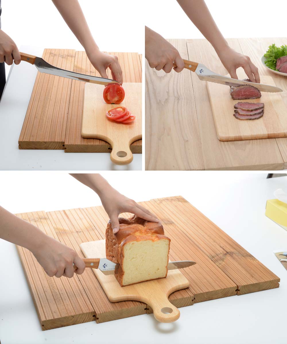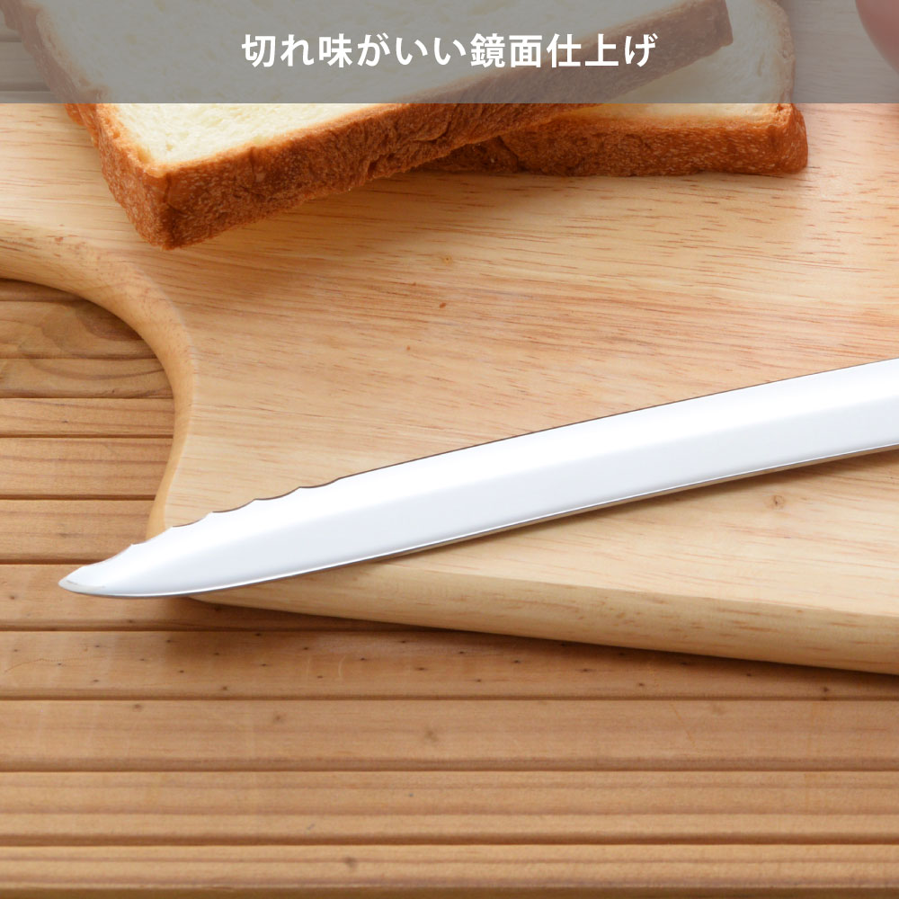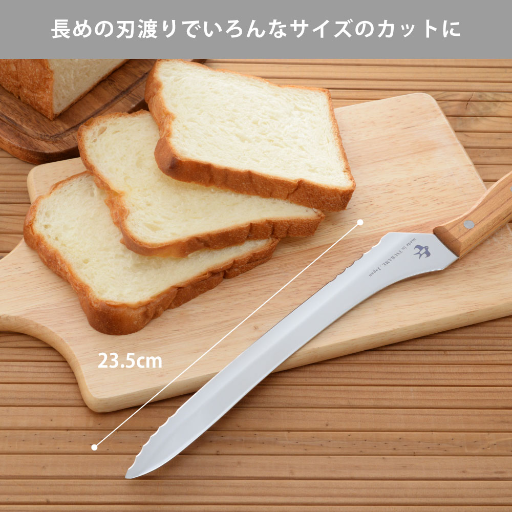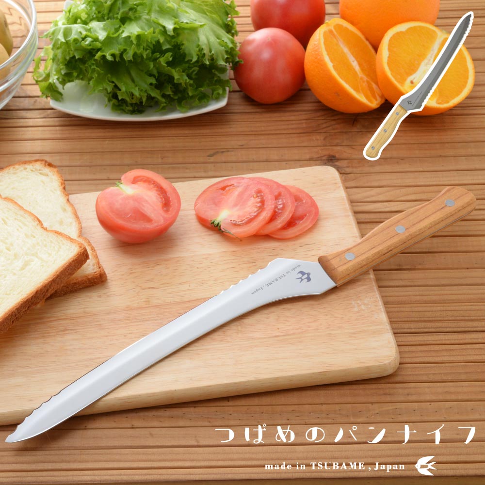 サイズ全長38.5×高さ4.5×厚み1.5cm刃渡り23.5cm重量約110g材質刃:モリブデンバナジウム ステンレス鋼ハンドル:天然木(ケヤキ)鋲:ステンレス生産国日本(新潟県燕市)波刃と直刃の2種類の刃の組み合わせで、かたいパンもやわらかいパンもキレイにカット波刃と直刃の2種類の刃の組み合わせによりパンの切り屑を抑えながらきれいに切り分けられるパンナイフです。波刃のきっかけにより硬いフランスパンも、刃が入らずに潰れやすい柔らかい食パンも簡単に切れます。刃渡り23.5cmと長く、色々な大きさのパンやホールのケーキにも便利です。天然木のケヤキを使用した手になじむ背通しハンドルで、まな板に指が当らない親切設計です。刃は特殊鋼材を使用し、見た目の美しさと同時に摩擦を減らし切れ味をアップさせた鏡面仕上げです。1.波刃と直刃波刃と直刃の組み合わせにより硬いパンから柔らかいパンまでつぶさずにきれいに切れ、パンの切りくずも抑えられます。2.天然木ハンドル手になじむ天然のケヤキを使用。切ったときにまな板に指が当たらない安心形状。3.燕市のパンナイフ金物の街「燕市」で作られた切れ味にこだわったパンナイフです。かわいい「つばめ」のロゴ入り。4.鏡面仕上げの秘密刃は食材との摩擦を減らし切れ味をアップさせ、見た目にも美しく仕上げてあります。