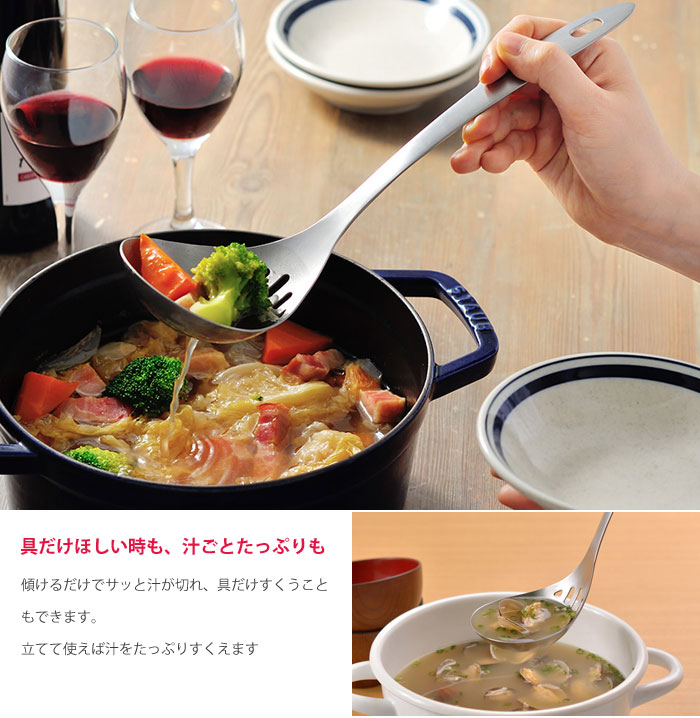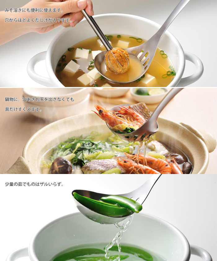 サイズ約 全長28.5×幅8×高さ7cm材質ステンレス鋼(クロム18%)重量約100g商品説明具だけほしい時も、汁ごとたっぷりも傾けるだけでサッと汁が切れ、具だけすくうこともできます。毎日の味噌汁やカレーなどに。穴からほどよくだし汁が入りみそ溶きにも使えます。卓上での鍋ものにも便利、穴あきお玉を出さなくても具だけをすくえます。特長●傾けるだけでサッと汁が切れ、具だけすくうこともできます。●ちょっとした茹でものにはザルがわりに使えます。●穴あきお玉を出さなくても具だけすくえて、鍋物の盛り付けは1本で。●オールステンレス製の一体成型で清潔に使えます。ブランドleyeメーカーAUX備考●日本製●食洗機可レイエ 水切りレードル LS1508