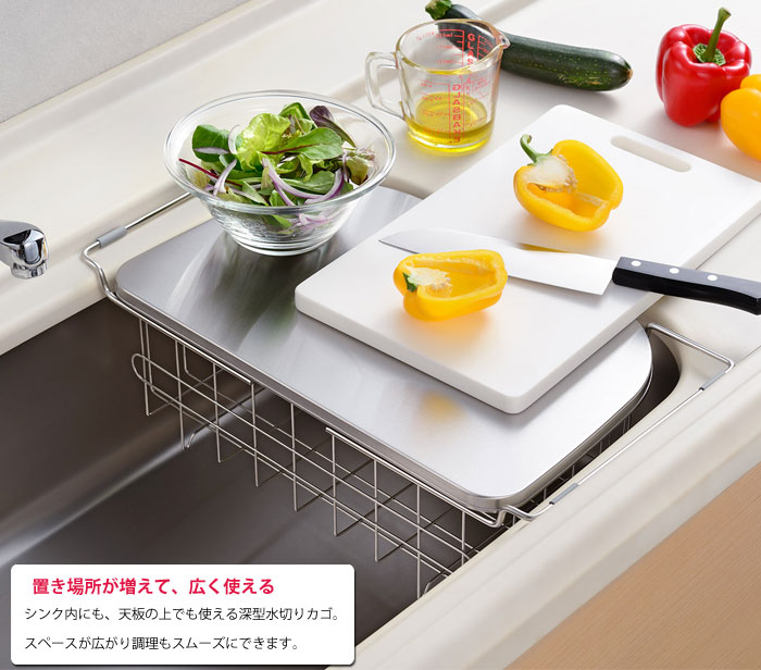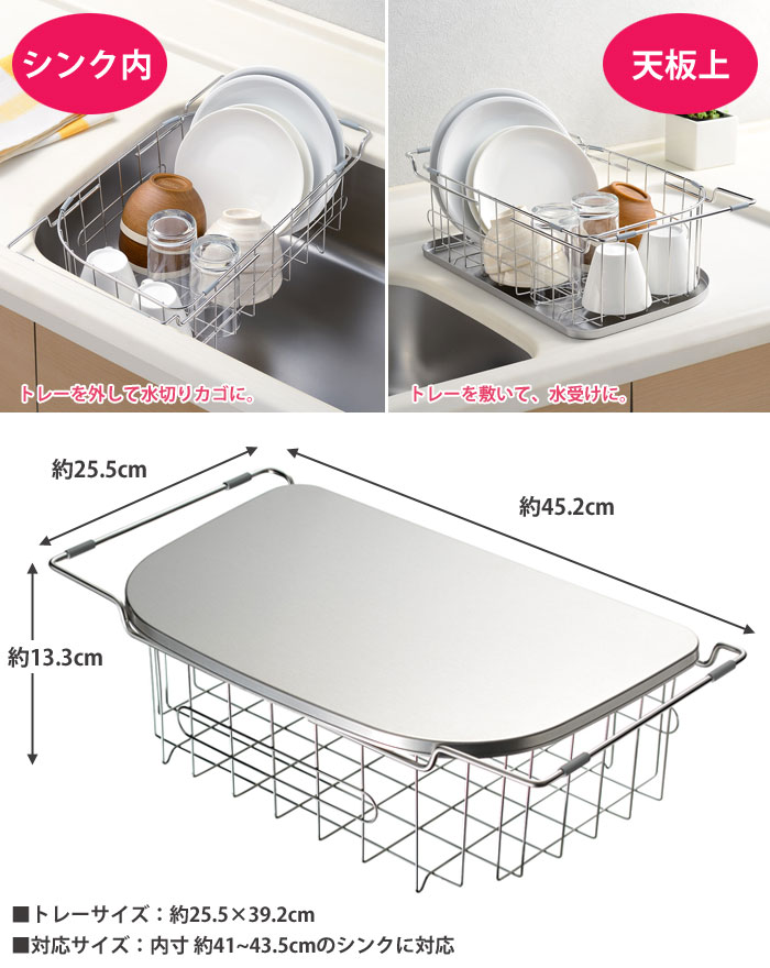 サイズ約 幅25.5×奥行45.2×高さ13.3cm(すべりどめゴム部含む)トレーサイズ:約幅25.5×奥行39.2cm材質本体:18-8ステンレストレー:18-0ステンレス脚ゴム:合成ゴム対応サイズ使用可能なシンクの奥行内寸:約41~43.5cm(伸縮しません)重量約920g商品説明シンク内にも、天板の上でも使える深型水切りカゴ。トレーはシンク内に調理スペースを広げたり、天板の上で水受けトレーとして使えます。シンクのコーナーにフィットする角丸形状。まな板受けとしても使えます。特長●置き場所が増えて、広く使えるバスケットの上にトレーをセットして使えば、スペースが広がり調理もスムーズにできます。●水切りカゴトレーを外すと、シンク内の水切りカゴに。洗い物がスムーズに行なえます。野菜の水切りなどにも。●天板の上でも天板の上でバスケットの下に敷いて、水受けトレーとして使えます。ブランドleyeメーカーAUX備考日本製レイエ 調理スペースが広がるトレー&水切り LS1538