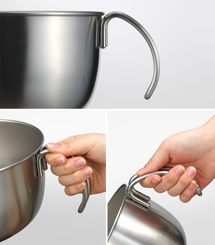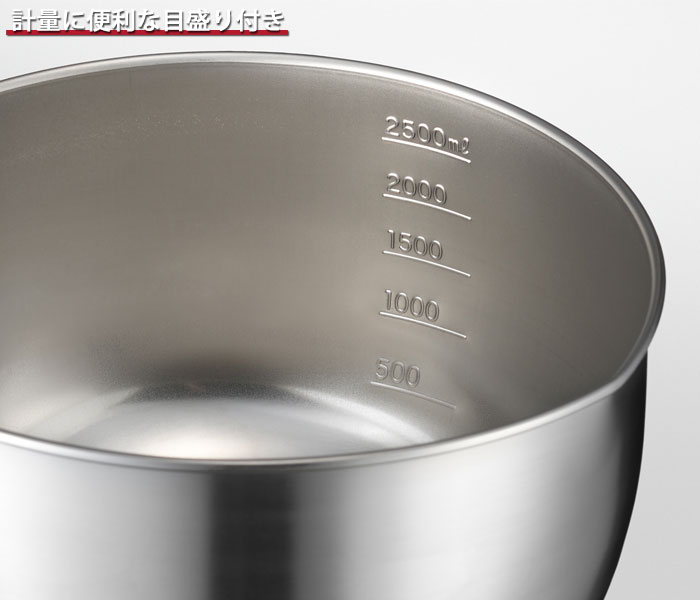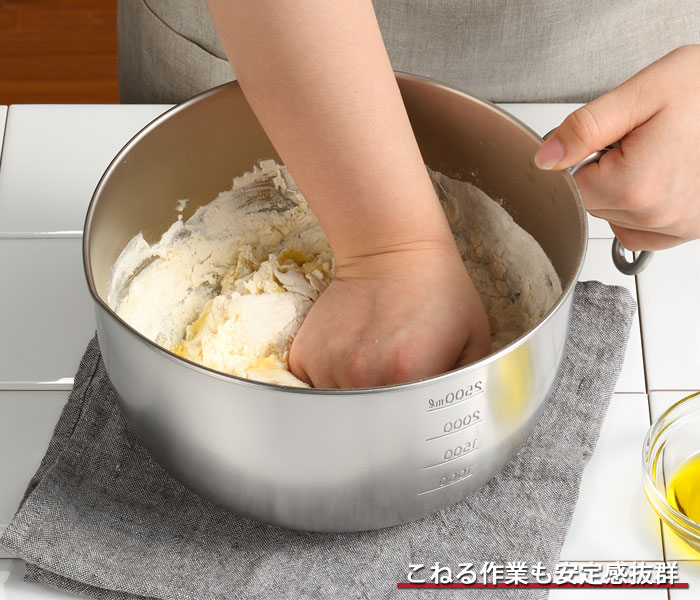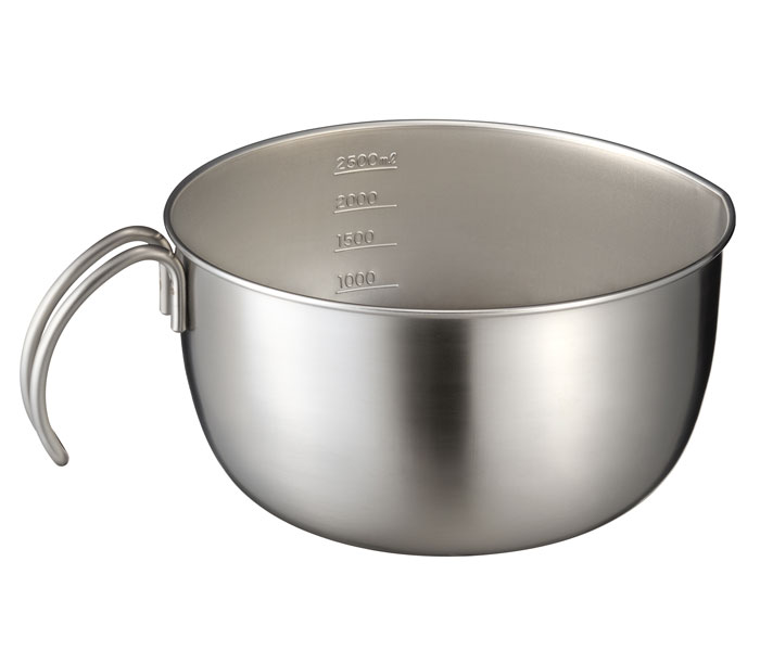 サイズ(約) W20×D26.8×H11.3cm材質ステンレス鋼(クロム18%、ニッケル8%)満水容量3L重量(約) 430gブランドleyeメーカーAUX備考●日本製●食洗機使用可●火にかけないでください。●電子レンジやオーブン、電磁調理器、電熱器等では使用しないでください。レイエ 取っ手付きミキシングボウル LS1566持ちやすさ、注ぎやすさ、ボウルの固定に配慮して設計された、取っ手付きステンレスボウル持ちやすさにこだわった取っ手付きのボウルで、しっかりと握れ、混ぜる、こねる、注ぐなどが楽になります。ハンドミキサーでの泡立てでも飛び散りにくい深型サイズ。計量に便利な目盛り付き。直径20cm、深型3Lの大容量で、食材が飛び散りにくいです。取っ手は角度、形状、取り付け位置を持ちやすさ、注ぎやすさ、ボウルの固定に配慮して設計されています。清潔でさびにくい18-8ステンレス製。底面積があり安定感がある形状です。しっかり握れるハンドルと注ぎ口で注ぐのもラクラク。こねる作業も安定感抜群。手が痛くなりにくく、能率がアップ。コンパクトな取っ手は冷蔵庫に入れても邪魔になりません。取っ手は開いた形状なので、他のボウルと重ねて収納できます。