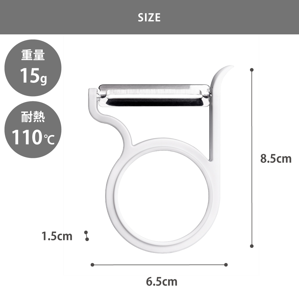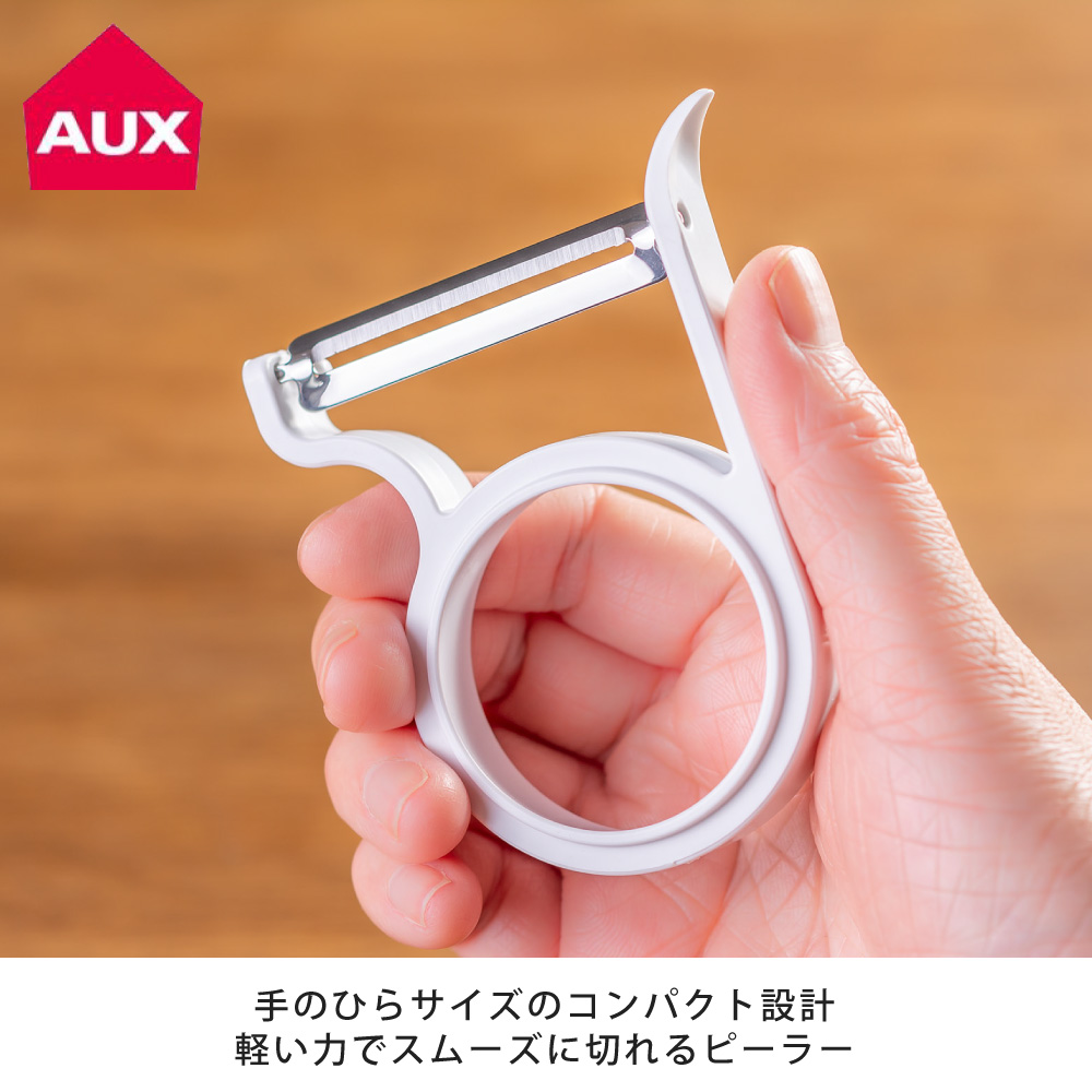サイズ約全長8.5×幅6.5×高さ1.5cm重量約15g材質本体:ABS樹脂(耐熱温度110℃)刃:ステンレス刃物材製造元AUXブランドleye生産国日本備考○食器洗い乾燥機使用可○刃は非常に鋭利になっていますので取扱いには十分ご注意ください。水分を拭き取り乾かしてから保管してください。刃の先端に、さらに刃付けし切れ味をアップ、燕三条の職人が作るピーラー軽い力でスムーズに切れるこだわりの燕三条職人刃。手の平感覚で使えるコンパクトなデザイン。刃物の産地、新潟県燕三条の職人が作るこだわりの刃は軽い力でスムーズに切れます。スタンダードな標準刃(平刃)。従来の刃付けに加え、刃の先端にさらに刃付けして切れ味アップ。じゃがいもや人参の皮むきが軽い力でできます。別売りのフルーツピーラー、千切りピーラーとスタッキングできるのですっきり収納できます。● 手の平感覚で使えるコンパクトなデザイン。● 刃物の産地、新潟県燕三条の職人が作るこだわりの刃。● 芽取りがあるのでじゃがいもの芽もクルッとスムーズに取れます。● シリーズの他アイテムとスタッキングできるのでスッキリ収納できます。