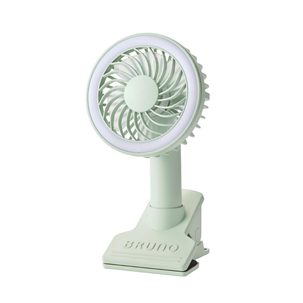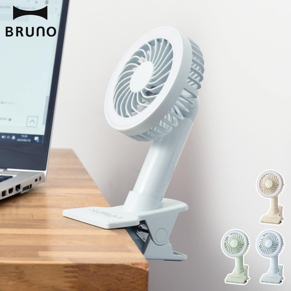 サイズ約W10.5xD10xH19.3cm重量約235g材質本体:ABS樹脂羽根:ポリプロピレン入力DC5V 1A Max.(USB充電式)充電時間約4.5時間(入力 5V 1Aの場合)連続使用時間扇風機使用時:約3~10時間扇風機、ライト使用時:約2.5~7.5時間機能風量3段階切替ライト2段階切替手持、卓上兼用型着脱式クリップ付スタンド上下角度調節(180°)電源リチウムイオン蓄電池付属品USBケーブルブランドBRUNO(ブルーノ)生産国中国涼しさと灯りがひとつになった3WAY仕様のミニ扇風機大きめのクリップ付きでベビーカーやデスク、日傘などに固定して使えるミニ扇風機。そのままスタンドにもなるのでデスクファンとしても、クリップを外してハンディファンとしても使用可能。ファンとライトが同時に使えるので、涼しさとともに暗い夜道やアウトドア、写真撮影などで大活躍。首の上下の角度は180°調節可能なため、取り付ける場所を選ばずにご使用いただけます。落ち着いた色合いのニュアンスカラーは、インテリアやファッションにさりげなく大人らしさをプラスします。
