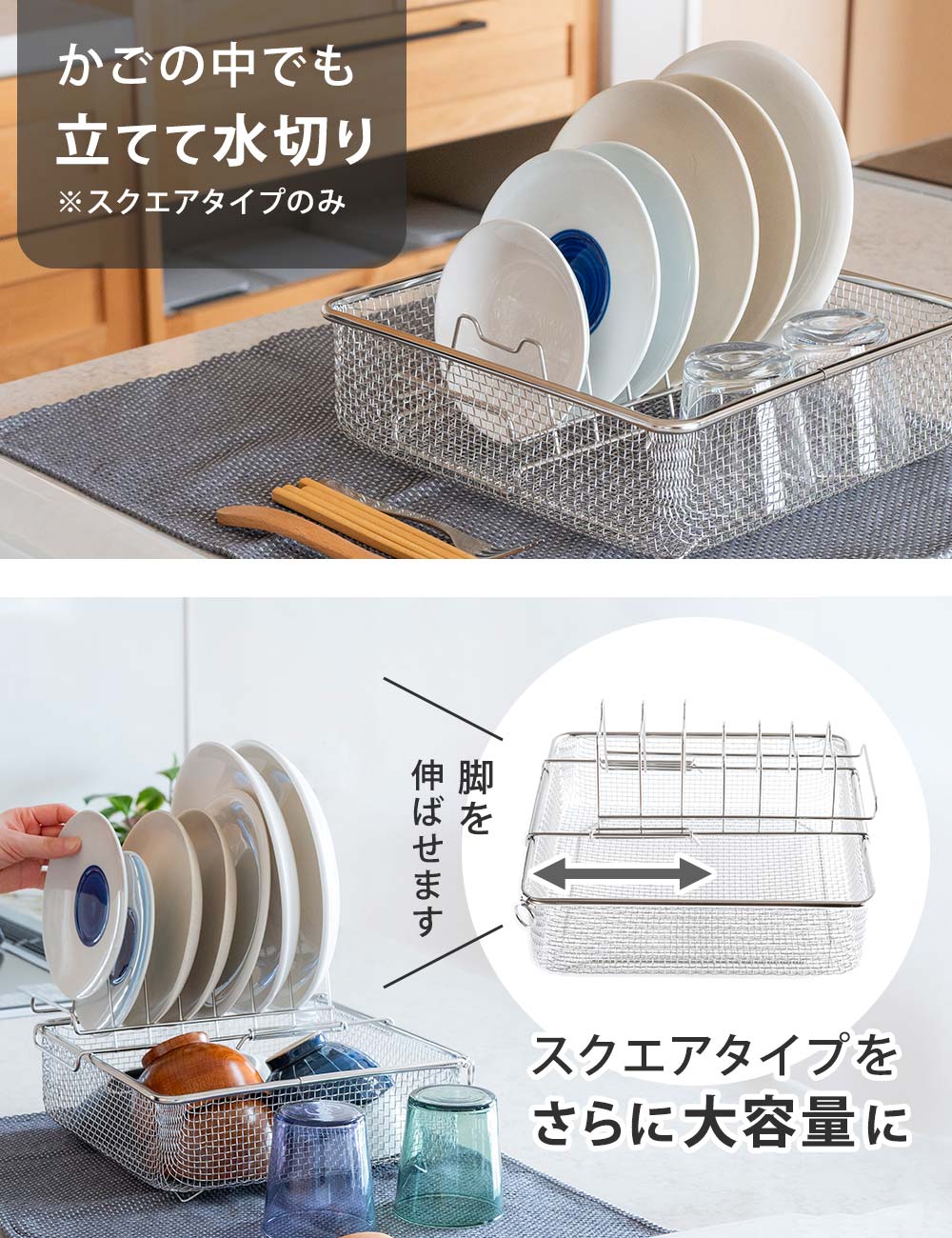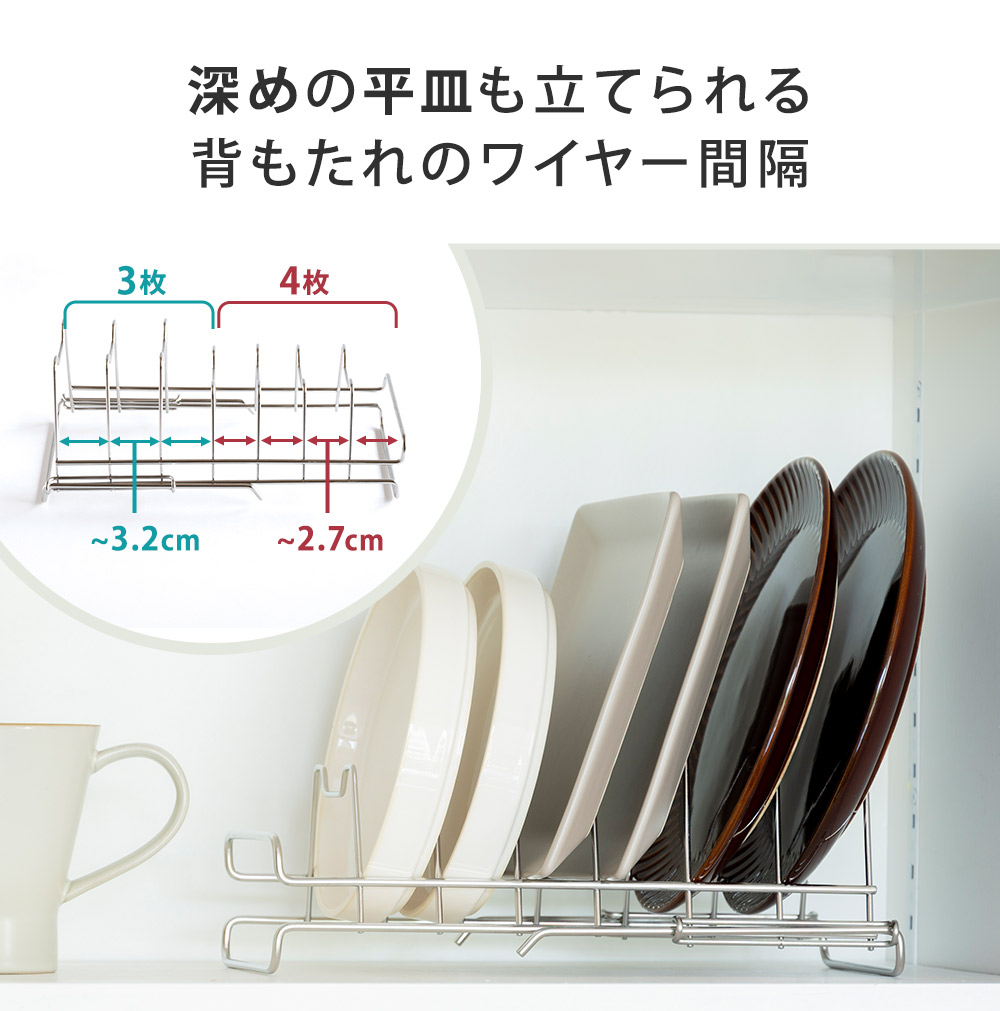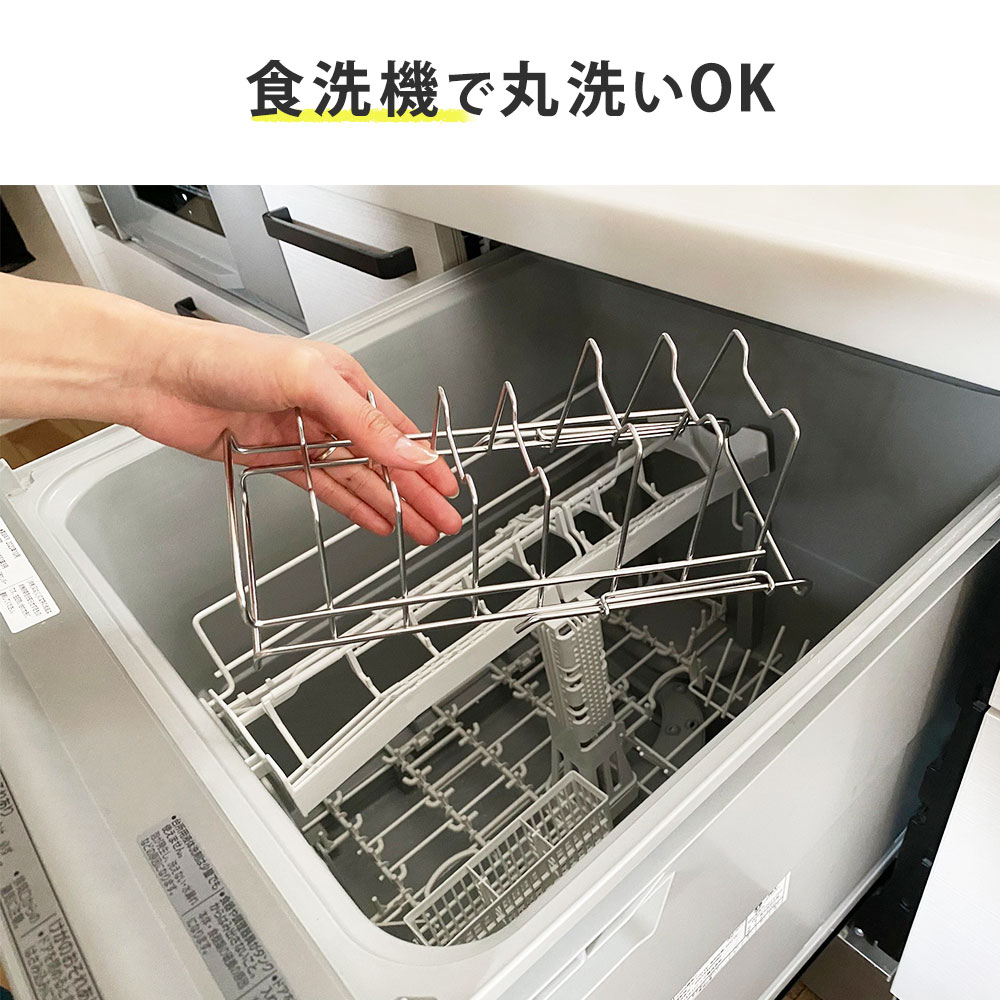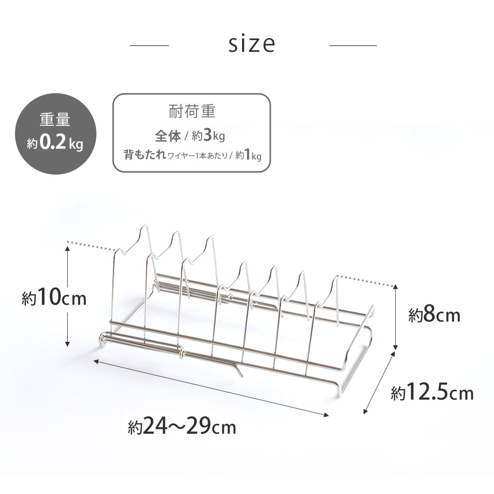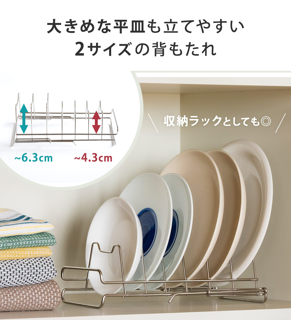 サイズ約 W240~290×D125×H100mm重量約0.2kg材質18-8ステンレス耐荷重全体:約3kg背もたれワイヤー1本あたり:約1kgシリーズすっきり暮らす製造元ビーワーススタイル生産国日本備考○ 食洗機対応大きめな平皿や深皿も立てやすい2サイズの背もたれすっきり暮らす水切りかごとセット使いが便利なディッシュラック。水切りかごで立てにくい平皿を安定して立てられるから、さらに乾きやすい。伸縮脚を伸ばし、水切りかごスクエアタイプの上に設置したら、2段式の水切りかごになります。カップボードでもお皿の整理・収納にもちょうどいいサイズ。収納ラックとしても使えます。燕三条の丈夫でサビ強い18-8ステンレス製。食洗機で丸洗いできてお手入れ簡単です。