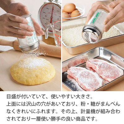 サイズ直径75×長さ120mm容量250cc材質本体:メタクリル樹脂キャップ:ポリエチレンフタ:18-8ステンレス(耐熱:80度、耐冷:-30度)重量120g商品説明目盛が付いていて、使いやすい大きさ。上面には沢山の穴があいていて、粉・糖がまんべんなくきれいにふれます。その上、計量器が組み合わされており一層使い勝手の良い商品です。ケーキに砂糖をふりかける際やクッキーやパイの生地に打ち粉を振りかける際に便利です。製造タイガークラウン備考●日本製●食器洗浄機、食器乾燥機には入れないでください。●たわし又はみがき粉で洗うと傷つくことがあります。