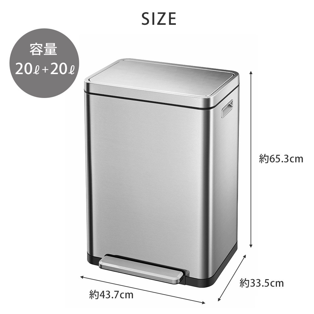 サイズ約幅43.7×奥行33.5×高さ65.3cm(蓋開口時の高さ:89.4cm)容量20L+20L重量7.7kg材質ステンレススチール,ポリプロピレン,シリコンブランドEKO生産国中国保証期間製造元保証1年間二重蓋とシリコンのシーリングでにおい漏れを防ぐ、ペダル式ゴミ箱防臭に徹底的にこだわったペダル式ゴミ箱。二重蓋とシリコンのシーリングでにおい漏れを防ぎます。ステンレス表面はナノ抗菌加工が施されており、インナーボックスのプラスチックも抗菌処理がされています。表面と開口部の抗菌加工で臭いの発生を抑えた上で更に二重の蓋が臭い漏れを防ぎます。フレーム蓋で間口を狭めその上にぴったりと、フタが閉じます。フタ裏には防臭剤入れポケットがついています。(防臭剤は付属していません。)エックスキューブステップビンは20L、30L、45L、20+20Lから置く場所に合わせてお選びいただけます。