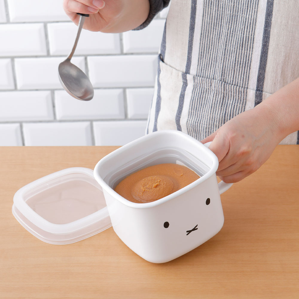 バリエーションミッフィーフェイス MFF-KPミッフィー70周年 MF70-KPサイズW 18.5 × D 14.5 × H 11.5cm満水容量1.5L容量目安●みそ 1kg(パック入の場合750g)●砂糖 900g、塩 1kg、小麦粉 800g重量540g材質本体:ほうろう用鋼板、蓋:ポリプロピレン,シリコン製造元富士ホーローシリーズミッフィー備考●タイ工場製(富士ホーロー 自社工場)●食洗機、電子レンジ使用不可●日本琺瑯工業会認定Sマーク取得●オーブン調理可(フタを外す)ホーローについて●手作業で釉薬を掛けるため、ひとつひとつの表情には多少の個体差が生じます。●ホーローの性質上、焼成時に黒点や色むらの様に見える部位が生じる場合がございます。●鋼板の切り口となる部分は釉薬がかかりにくく、下地の黒いスジが多少見られますが黒い部分もホーロー加工が施されております。※上記の様な場合でも不良ではなくご使用には問題ございませんので安心してお使い下さい。味噌の乾燥を防いで美味しく保存 ミッフィーの味噌ポットミッフィーがデザインされた、かわいい味噌ポット。市販の味噌パック(750g)がケースごとぴったり入ります。大きな取っ手で冷蔵庫から取り出しやすく、鍋に味噌を入れる時も持ちやすい形状。キッチンでの取り回しがとっても楽ちんです。密閉できる蓋なので、乾燥・酸化を防ぎ、お味噌の風味を守ります。お味噌以外にも幅広く保存容器としてもご利用いただけます。POINT●市販のみそパック750gがちょうど入ります。毎日使うものだから清潔で安心な素材をおすすめします。●密閉できるフタ付なので乾燥を防ぎます。●フタを外してオーブン調理可能味噌以外の保存にも表面がガラス質でできているホーローは、調味料や薬味・スパイスなどを入れてもにおいがつきにくく清潔です。鋼板に白い釉薬をまとったホーローは熱に強くオーブン調理が可能です。(電子レンジ使用不可)ニオイがつきにくく、汚れを落としやすいので、食材の保存にも最適です。※加熱調理時は必ずフタを外してください。コンロで煮物などを保存した容器をそのまま火にかけて温めることができます。オーブンでグラタンやラザニア、焼き菓子など容器を調理器具として使用できます。ミッフィーフェイスは表面と裏面でそれぞれ違う表情が楽しめます。70周年デザインは表面と裏面は同じデザインです。2025年はミッフィー誕生70周年。ミッフィーの初めての絵本『ナインチェ』は1955年にオランダで出版されました。アニバーサリーイヤーを記念して、各年代のミッフィーが並ぶ70周年限定デザインのホーローシリーズです。調理器具や保存容器など豊富なラインアップ。シリーズで揃えたくなる可愛さです。