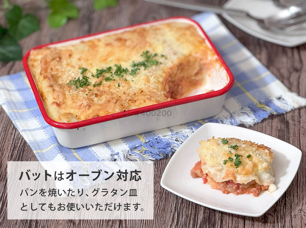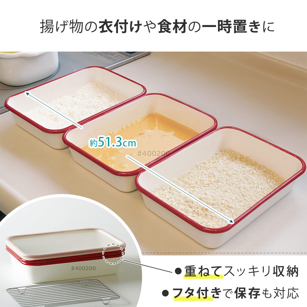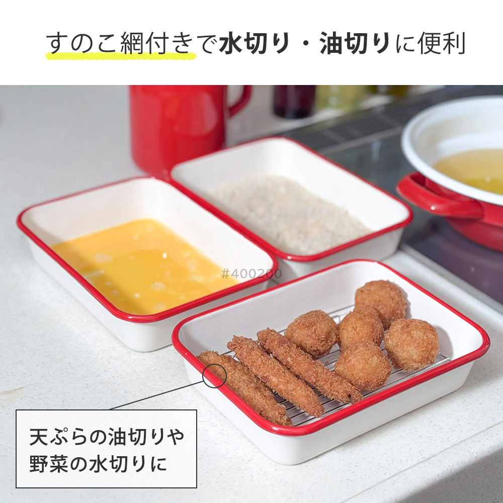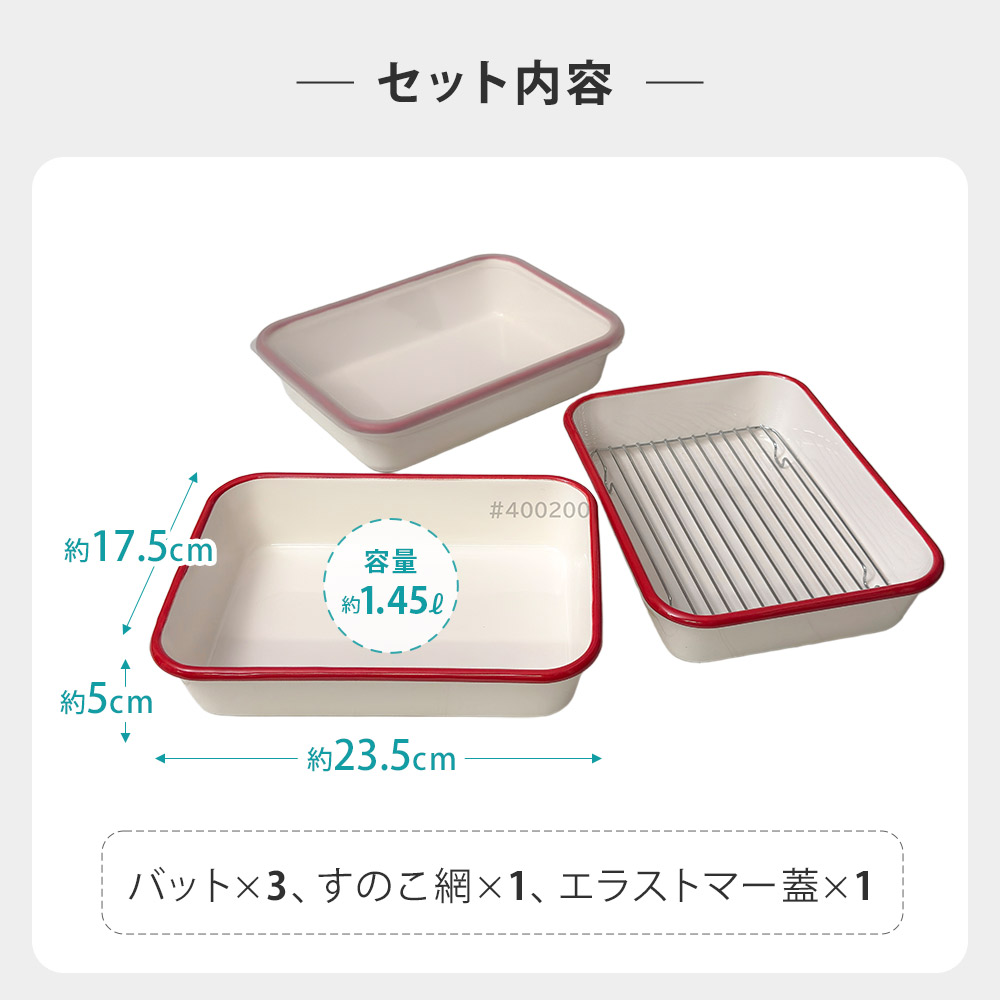セット内容バット×3、すのこ網×1、エラストマー蓋×1サイズW23.2×D17.1×4.9cm/1個重量1.31kg満水容量1.45L/1個材質本体:ほうろう用鋼板、すのこ:ステンレス、蓋:ポリプロピレン,可塑性エラストマー生産国タイ(富士ホーロー 自社工場)製造元富士ホーローホーローについて・手作業で釉薬を掛けるため、ひとつひとつの表情には多少の個体差が生じます。・ホーローの性質上、焼成時に黒点や色むらの様に見える部位が生じる場合がございます。・鋼板の切り口となる部分は釉薬がかかりにくく、下地の黒いスジが多少見られますが黒い部分もホーロー加工が施されております。※上記の様な場合でも不良ではなくご使用には問題ございませんので安心してお使い下さい。備考○電子レンジ使用不可○バットのみ食洗機使用可○日本琺瑯工業会認定Sマーク取得揚げ物調理に活躍する深型のバットセット揚げ物の衣つけや、食材の下ごしらえや一時置きに使えます。バットに網をセットすれば、天ぷらバットとして油切りできます。鍋料理の際は野菜の水切りにもおすすめです。マリネなどのつけこみ調理や食材の一時保存など幅広く使えます。フタ付きなので食材の保存もできて便利です。バットはオーブンに入れられるのでパンを焼いたり、グラタン皿としてもお使いいただけます。バットのみ食洗機でのお手入れが可能です。