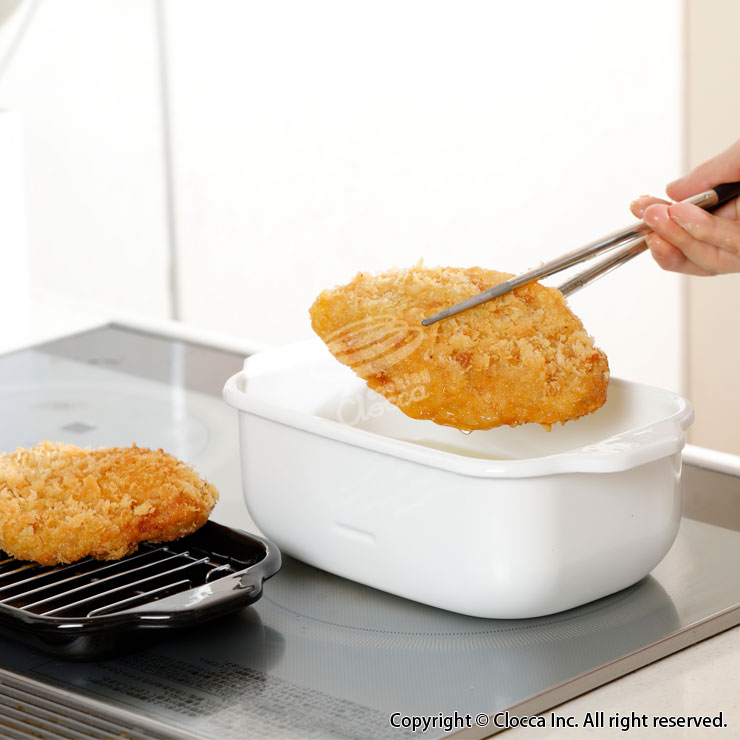 サイズ約 W25×D14.5×H9.0cm重量約980g満水容量約1.8L適正油量約600g(0.65L)材質ほうろう用鋼板付属品バット、スノコ 各1個対応熱源ガスコンロ(直火),IH調理器(100V/200V),シーズ,ハロゲン,ラジエント※IH調理器では、レベル「中」以下からはじめて、徐々に温度を上げてご使用ください。※IH調理器の揚げ物モード、天ぷらモードなどではご使用いただけません。製造元富士ホーローホーローについて●手作業で釉薬を掛けるため、ひとつひとつの表情には多少の個体差が生じます。●ホーローの性質上、焼成時に黒点や色むらの様に見える部位が生じる場合がございます。●鋼板の切り口となる部分は釉薬がかかりにくく、下地の黒いスジが多少見られますが黒い部分もホーロー加工が施されております。※上記の様な場合でも不良ではなくご使用には問題ございませんので安心してお使い下さい。備考●タイ工場製(富士ホーロー 自社工場)●電子レンジ使用不可●IH調理器の揚げ物モード非対応●日本琺瑯工業会認定S(200V IH)マーク取得●食洗機対応サイズ約 W25×D14.5×H9.0cm重量約980g満水容量約1.8L適正油量約600g(0.65L)材質ほうろう用鋼板付属品バット、スノコ 各1個対応熱源ガスコンロ(直火),IH調理器(100V/200V),シーズ,ハロゲン,ラジエント※IH調理器では、レベル「中」以下からはじめて、徐々に温度を上げてご使用ください。※IH調理器の揚げ物モード、天ぷらモードなどではご使用いただけません。製造元富士ホーローホーローについて●手作業で釉薬を掛けるため、ひとつひとつの表情には多少の個体差が生じます。●ホーローの性質上、焼成時に黒点や色むらの様に見える部位が生じる場合がございます。●鋼板の切り口となる部分は釉薬がかかりにくく、下地の黒いスジが多少見られますが黒い部分もホーロー加工が施されております。※上記の様な場合でも不良ではなくご使用には問題ございませんので安心してお使い下さい。備考●タイ工場製(富士ホーロー 自社工場)●電子レンジ使用不可●IH調理器の揚げ物モード非対応●日本琺瑯工業会認定S(200V IH)マーク取得●食洗機対応人気の角型天ぷら鍋 本体&揚げ網&バットのシンプルなセット人気の角型天ぷら鍋に揚げ網とバットのみのシンプルなセットが登場。温度計を使わない方やすでにお持ちの方に向けて、従来品から温度計を外してお求めやすい価格に設定しました。少ない油で揚げ物に十分な深さを確保したスリムな角型の揚げ鍋です。海老天、アスパラガス、ロースかつなど長めの食材も調理しやすい横長設計。琺瑯素材は熱効率が良く、揚げ物がカラッと仕上がります。揚げ物調理に便利なバット&揚げ網が付属しています。付属品は本体と重ねてコンパクトに収納できます。表面は滑らかなガラス質で、油汚れもすっきりと洗い落せます。食洗機でのお手入れが可能で片付けが簡単です。ライトグレーとバニラはクロッカオリジナルカラーです。●少ない油で調理できる少ない油で揚げ物に十分な深さを確保できます。(本体に適正油量約600gの目安刻印入り)●長めの食材もOKエビ天、アスパラガス、ロースカツなど、長めの食材も揚げやすい。●スマートに移し替え油の移し替えは、鍋のコーナーが注ぎ口の代わりになります。●お手入れ簡単琺瑯の滑らかな表面は油汚れもすっきりと洗い落とせます。食洗機でのお手入れも可能です。●重ねてコンパクトに収納付属のバットとスノコを重ね合わせて、省スペースに収納できます。大好評の富士ホーロー 角型天ぷら鍋に「ワイド」が登場。コンパクトなフォルムと琺瑯ならでは機能はそのままに、本格使用に必要十分な容量をプラスしました。