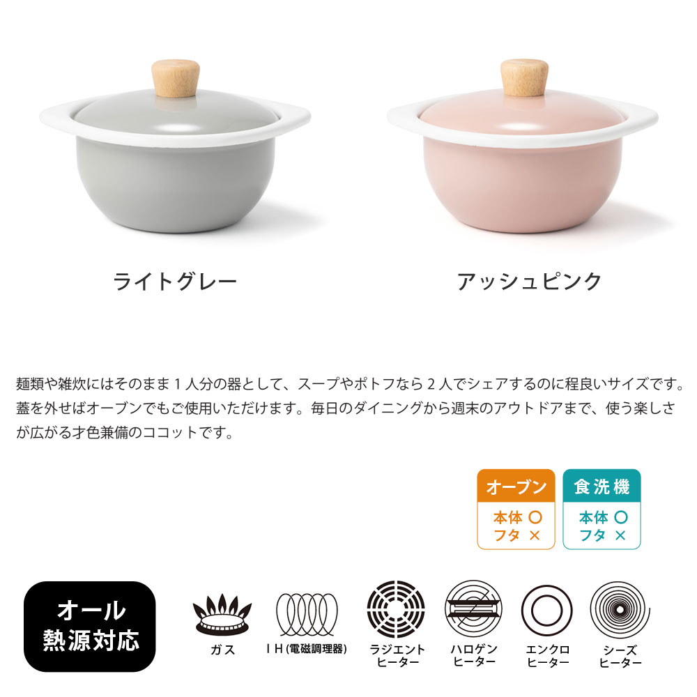 サイズ(約)W 20.5 × D 18.0 × H 12.0cm満水容量1.2L重量(約)640g材質本体:ほうろう用鋼板、つまみ:天然木対応熱源ガスコンロ(直火)、IH(200V/100V)、シーズ、ハロゲン、エンクロ、ラジエント、オーブン(フタを外す)シリーズCotton製造元富士ホーロー備考●タイ工場製(富士ホーロー 自社工場)●電子レンジ使用不可●日本琺瑯工業会認定S(200V IH)マーク取得ホーローについて●手作業で釉薬を掛けるため、ひとつひとつの表情には多少の個体差が生じます。●ホーローの性質上、焼成時に黒点や色むらの様に見える部位が生じる場合がございます。●本体フチ部分など、鋼板の切り口となる部分は釉薬がかかりにくく、下地の黒いスジが多少見られますが黒い部分もホーロー加工が施されております。※上記の様な場合でも不良ではなくご使用には問題ございませんので安心してお使い下さい。一人分の麺類や雑炊を調理してそのまま食卓へ麺類や雑炊にはそのまま一人用の鍋兼食器として、スープやポトフなら2人でシェアするのに程よいサイズです。ガラス質のホーローは食材のニオイ移りや色移りを気にせず調理することができます。また金属イオンが発生しないため、食材の風味を損ねることなく美味しく仕上がります。ホーローは熱に極めて強いので、蓋を外してオーブン調理も可能。プディングやグラタンなど、オーブン型としてもお使いいただけます。調理してそのまま食器にもなる、使う楽しさが広がる才色兼備のココットです。