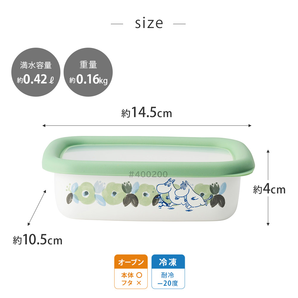 サイズ約W14.5×D10.5×H4.0cm(蓋含む)満水容量0.42L重量約160g材質本体:ほうろう用鋼板、蓋:ポリプロピレン,エラストマーシリーズムーミン製造元富士ホーローホーローについて●手作業で釉薬を掛けるため、ひとつひとつの表情には多少の個体差が生じます。●ホーローの性質上、焼成時に黒点や色むらの様に見える部位が生じる場合がございます。●鋼板の切り口となる部分は釉薬がかかりにくく、下地の黒いスジが多少見られますが黒い部分もホーロー加工が施されております。※上記の様な場合でも不良ではなくご使用には問題ございませんので安心してお使い下さい。備考○タイ工場製(富士ホーロー 自社工場)○電子レンジ使用不可○日本琺瑯工業会認定Sマーク取得○フタを外してオーブン調理可酸や塩分に強く食材の保存に適した琺瑯容器北欧風のお花とムーミンたちが楽しく料理を彩る、ムーミンフラワーガーデン。琺瑯は酸や塩分に強いため食材の保存に適しています。表面のガラス質は汚れがつきにくく、匂いうつりも少ないので、キムチなどの発酵性食品のほかさまざま食材のストックが可能です。また、耐熱性が高いためオーブンでの調理にも使えます。グラタンやパン、焼き菓子の型としてもおすすめです。フタは透明度があり中身が見やすく、縁がエラストマー製なので丈夫で破損しにくいので長持ちします。ホーロー容器の特徴●表面が硬く、すべすべしたガラス質なので雑菌が繁殖しにくく、衛生的です。●非吸着性が抜群で、容器にニオイがつきません。●ガラス質は中性で不活性。食品と化学反応を起こしにくいので風味を損ないません。●耐久性抜群ですので、オーブンや冷凍庫の保存にも使えます。●酸や塩に極めて強いので食品の保存容器に最適です。●コンロ(直火)やオーブン調理をすることができます。コンロで煮物などを保存した容器をそのまま火にかけて温めることができます。オーブンでグラタンやラザニア、焼き菓子など容器を調理器具として使用できます。※コンロで使用する場合、炒める・炒るなど水分をほとんど使わない調理をすると表面のガラス質が破損する場合があります。※カレー、シチューなどは水分が少ないので、かき混ぜながら加熱してください。