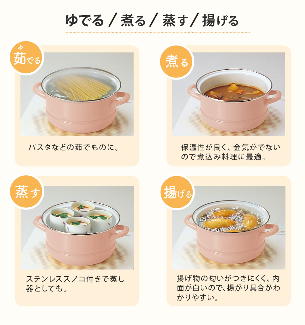 サイズ蓋セット時:約W25×D20×H16.5cm本体深さ:約9.9cm蓋:約W24.8×D19.3×H7.1cm蓋深さ:約6.7cm重量本体:約1060g、蓋:約400g、ポリ蓋:約40g満水容量本体:2.4L、蓋:1.6L材質本体,蓋:ほうろう用鋼板,ステンレス、すのこ:ステンレス、ポリ蓋:ポリエチレン付属品すのこ、蓋用ポリ蓋対応熱源ガスコンロ(直火)・IH調理器(100V/200V)・シーズ・ハロゲン・ラジエント生産国タイ(富士ホーロー 自社工場)製造元富士ホーローホーローについて●手作業で釉薬を掛けるため、ひとつひとつの表情には多少の個体差が生じます。●ホーローの性質上、焼成時に黒点や色むらの様に見える部位が生じる場合がございます。●鋼板の切り口となる部分は釉薬がかかりにくく、下地の黒いスジが多少見られますが黒い部分もホーロー加工が施されております。※上記の様な場合でも不良ではなくご使用には問題ございませんので安心してお使い下さい。備考○電子レンジ使用不可○食洗機使用可(ポリ蓋は不可)○日本琺瑯工業会認定S(200V IH)マーク取得煮る、蒸す、保存が得意なホーロー製多機能鍋蓋も浅型鍋として使えるスチーマー鍋。本体に付属のすのこをセットして蒸し料理に。高さがあるドーム蓋は、茶わん蒸しやプリンなども蒸すことができます。料理やマリネなどを冷蔵庫で保存する際に便利なポリ蓋付き。蓋は鍋として使えるので余った料理を保存して、食べる時は火にかけて温めることができるので別の容器へ移す手間が省けます。本体と蓋はオーブン調理にも対応しています。煮る・蒸す・揚げる・茹でるなど多機能に幅広い調理に使えます。