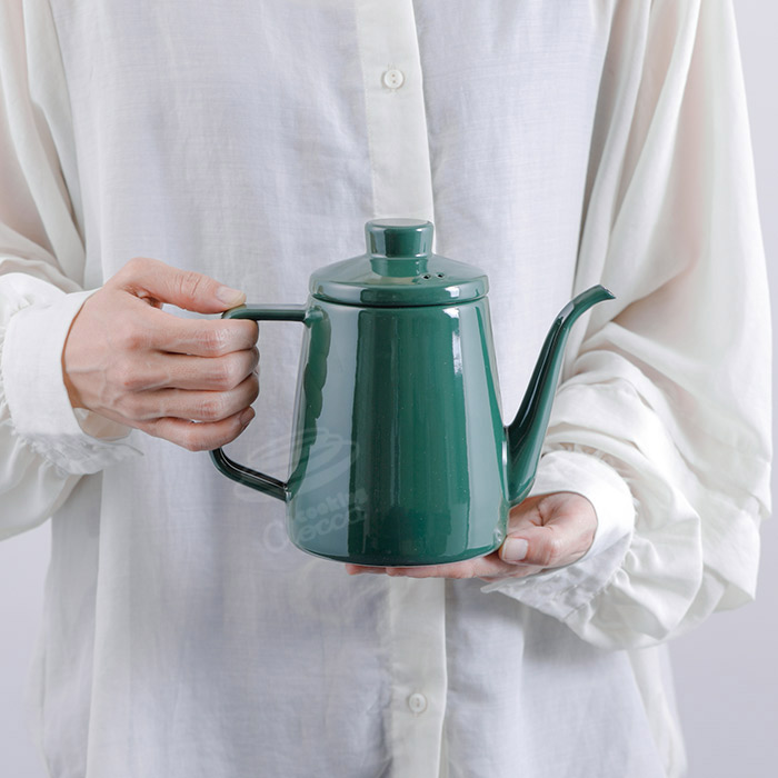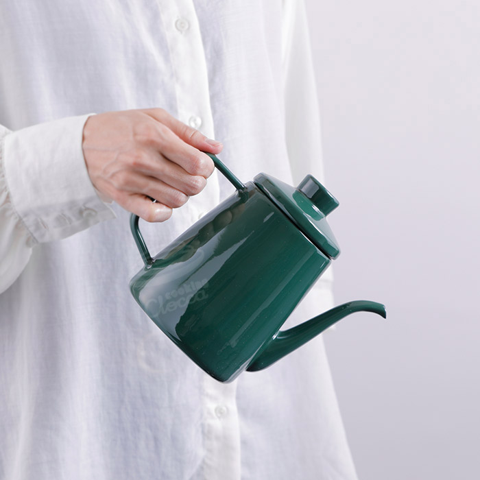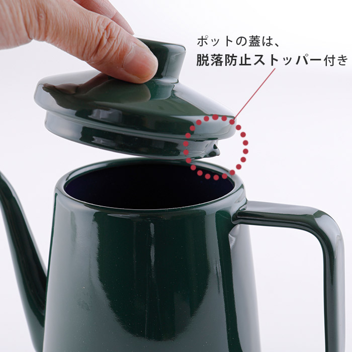 サイズ約W21×D11×H16.5cm重量約540g満水容量約1.0L※吹きこぼれ防止のため、約60~70%の水位でご使用ください。材質ほうろう用鋼板対応熱源ガスコンロ(直火),IH調理器(100V/200V),シーズ,ハロゲン,ラジエントシリーズSolid(ソリッド)製造元富士ホーローホーローについて●手作業で釉薬を掛けるため、ひとつひとつの表情には多少の個体差が生じます。●ホーローの性質上、焼成時に黒点や色むらの様に見える部位が生じる場合がございます。●鋼板の切り口となる部分は釉薬がかかりにくく、下地の黒いスジが多少見られますが黒い部分もホーロー加工が施されております。※上記の様な場合でも不良ではなくご使用には問題ございませんので安心してお使い下さい。備考○タイ工場製(富士ホーロー 自社工場)○電子レンジ使用不可○日本琺瑯工業会認定S(200V IH)マーク取得コーヒーの味や香りをそのまま味わえるすべてが琺瑯素材のドリップポットコーヒーを入れるときに、細くゆっくりと注げる細口タイプ。繊細に湯量をコントロールできます。おいしいコーヒーを淹れるには、何といっても金気を出さない琺瑯ポットが一番です。水本来のおいしさを損なわず、本当のコーヒーの味を楽しむことができます。コーヒーのドリップだけでなく、少しお湯を沸かしたい時にも手軽なサイズのドリップポットです。使いやすさをとことん追求したムダのないシンプルな形状。内面は耐久性が高い、紺色の耐熱水性釉薬という特殊なホーロー仕上げ。本体、蓋、ハンドル、すべてが琺瑯製なので耐久性が高く、末永くご使用いただけます。食洗機でのお手入れもOK。フタの内側にお湯をそそぐときにフタが落ちるのを防ぐツメが付いているので、熱いお湯を注ぐときも安心です。(蓋のツメをハンドル側にセットしてください。)※湯沸かし後のハンドルは熱くなりますのでミトンやふきんなどをご使用ください。