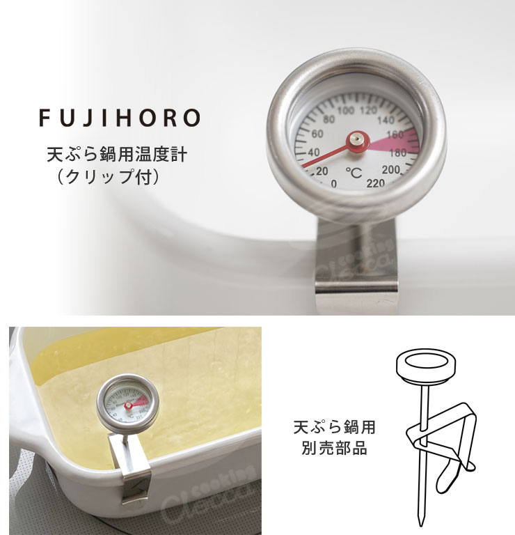 サイズ約W11.2×D3.2×H4.2cm重量約22g主な材質ステンレス製造元富士ホーロークリップ式で鍋のフチに固定できる天ぷら鍋用の温度計富士ホーローの角型天ぷら鍋にぴったりな温度計。クリップ付きで鍋の側面にはさんで使用できます。温度計があると揚げ時が一目で分かり、大変便利です。220℃まで表示可能です。ご使用の際は、温度計の先端が鍋の底部に触れないようにセットしてください。クリップを取り外して水洗いできるので、清潔に使うことができます。
