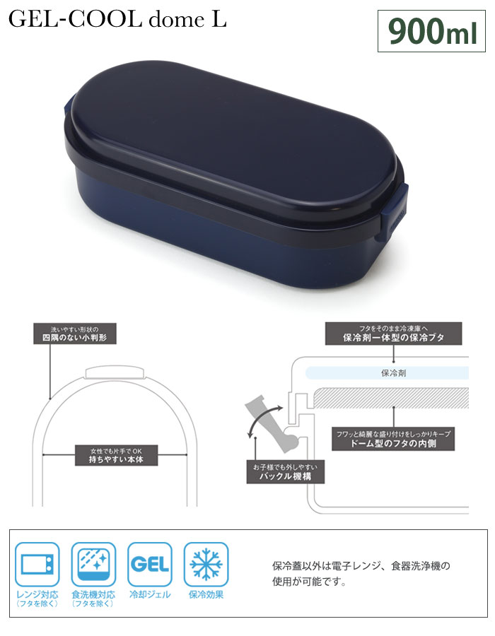 サイズW22.7×D10.8×H6.8cm容量約900ml材質本体、仕切り:ポリプロピレン (耐熱温度/耐冷温度:140℃/-20℃)保冷蓋:ABS樹脂 (耐熱温度/耐冷温度:60℃/-20℃)パッキン:シリコンゴム使用方法保冷蓋を冷凍庫で6時間程凍らせてから本体にセットしてください。保冷効果(外気温25℃) 15℃以下、4時間程度(外気温30℃) 15℃以下、3時間程度※5度以下に冷やした食材を入れた場合※ご使用の状況により、保冷データ通りにならない場合がございます。※上記は目安です。保冷バッグ等を併用していただくと、より長く保冷効果は持続します。メーカー三好製作所生産国日本備考●本体のみ電子レンジ、食洗機対応 (保冷蓋は非対応) ●ジェルクール ドームL
