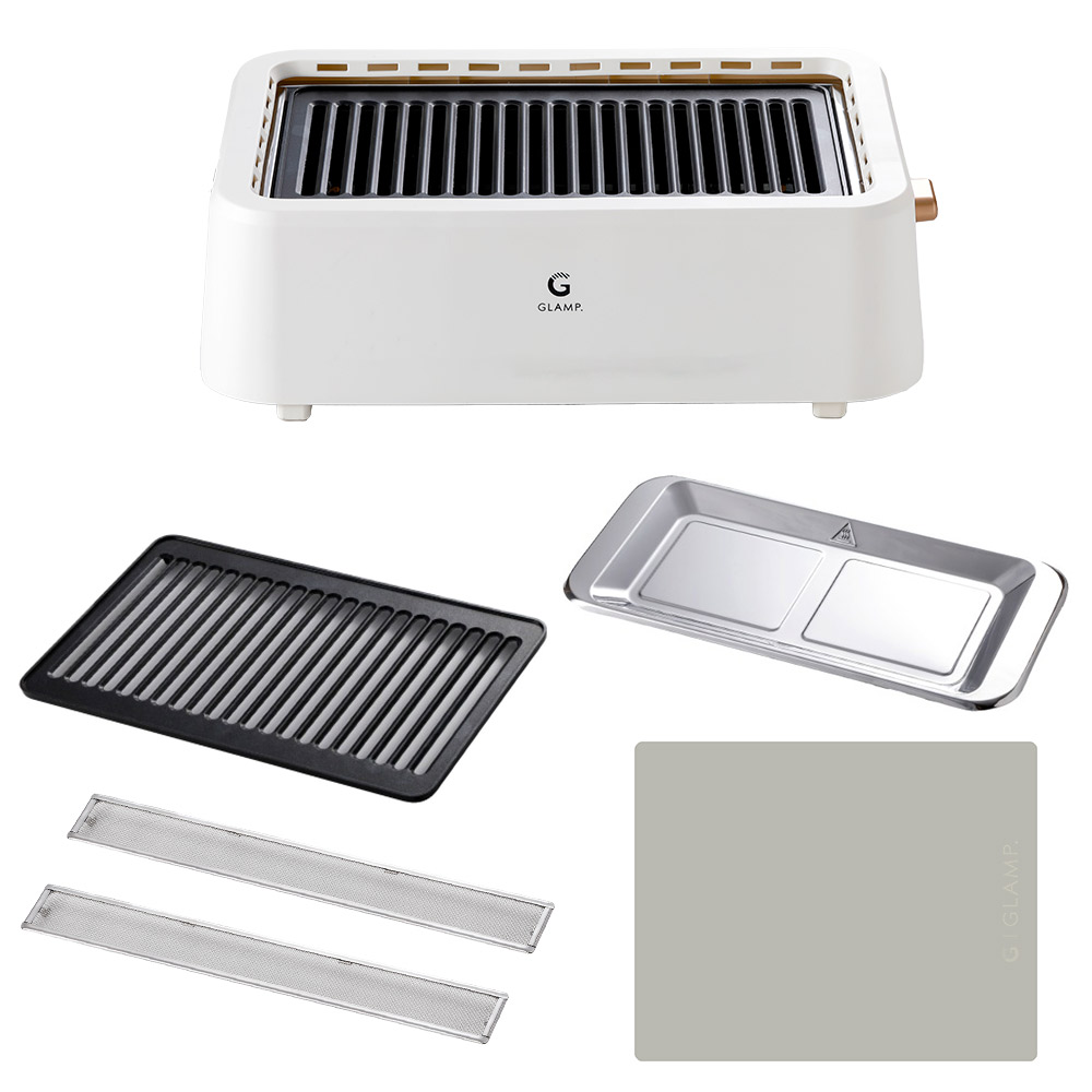 サイズ本体:W41.3xD27.2xH12.3cm電源コード長さ:約2m材質本体:PBT樹脂フィルター,オイルドリップトレー:ステンレススチールグリルプレート:アルミニウム(テフロン加工)重量2,228g消費電力1200W電源AC100V 50/60Hz温度設定ON・OFFスイッチのみ 230℃(±15℃)ブランドGLAMP.生産国中国使用上の注意●耐熱性のない樹脂製テーブルの上に直接設置してご使用になると、天板が溶けたり焦げたりする可能性があり、危険です。必ずシリコーン等の耐熱性がある土台の上でご使用ください。●水をオイルドリップトレーに追加する際に、絶対に本体上部から直接注がないでください。飛散した油がヒーター部分に温められて大きな炎が上がることがあり、大変危険です。●使用中は、グリルプレートの一部を熱放散のために空けておいてください。グリルプレートを塞いでしまう大きな食材を焼いたり、プレート全体をアルミホイルで覆わないでください。●食用オイルスプレーを使用して油をグリルプレートや食べ物に噴射しないでください。備考○ メーカー保証1年サイズ本体:W41.3xD27.2xH12.3cm電源コード長さ:約2m材質本体:PBT樹脂フィルター,オイルドリップトレー:ステンレススチールグリルプレート:アルミニウム(テフロン加工)重量2,228g消費電力1200W電源AC100V 50/60Hz温度設定ON・OFFスイッチのみ 230℃(±15℃)ブランドGLAMP.生産国中国使用上の注意●耐熱性のない樹脂製テーブルの上に直接設置してご使用になると、天板が溶けたり焦げたりする可能性があり、危険です。必ずシリコーン等の耐熱性がある土台の上でご使用ください。●水をオイルドリップトレーに追加する際に、絶対に本体上部から直接注がないでください。飛散した油がヒーター部分に温められて大きな炎が上がることがあり、大変危険です。●使用中は、グリルプレートの一部を熱放散のために空けておいてください。グリルプレートを塞いでしまう大きな食材を焼いたり、プレート全体をアルミホイルで覆わないでください。●食用オイルスプレーを使用して油をグリルプレートや食べ物に噴射しないでください。備考○ メーカー保証1年驚くほど煙が出ない異次元の超少煙グリル熱源をグリルのサイドに配置し、油を下に落とすので、油と熱源が触れないことで煙が出ない構造。熱源回りもミラーフィニッシュのステンレスを使用しているのでサイドからの熱を食材に反射させ、ムラなくしっかりと焼けます。遠赤外線効果により、食材の芯までじんわりと焼けるので、まるで炭火焼きのように柔らく旨みを閉じ込めた美味しい焼き上がりになります。少ないパーツでお手入れが簡単。グリルプレート、フィルター、オイルドリップトレーは水洗い出来るので、次使う時でも清潔にキレイをキープできます。焦げ付き防止のフッ素コーティングがされたグリルプレートは、取り外し可能。金網のようにすぐに焦げ付かず、お手入れしやすいシンプル設計にこだわりました。こびりつきにくい仕様のプレートで、油はねも気になりません。調理中は、ファンレス設計でほぼ無音のため、家族や友人とグリルを囲んで会話を楽しめます。超少煙グリル調理の豆知識■ 食材の大きさや厚みによって、調理時間は異なります。■ 脂分の多い食材をグリルすると、調理中に煙が出ることがあります。■ 調味料に油を多く使用しないでください。油が多いと調理中の煙の原因となります。■ グリルプレートの予熱には6~7分かかります。■ ナイフやフォークなど、金属製の鋭利な調理器具は使用しないでください。グリルプレートのノンスティックコーティングを傷つける恐れがあります。■ 調理中は食材を頻繁に裏返さないでください。■ 串焼きをする際は、竹串や木串をまず水に浸しておいてください。焼いている間に燃えるのを防ぎます。金属製の串は使用しないでください。■ 2~3回の調理ごとに、オイルドリップトレーに溜まった油と水を捨て、新しい水に入れ替えて使用すると煙の発生をより抑えられます。